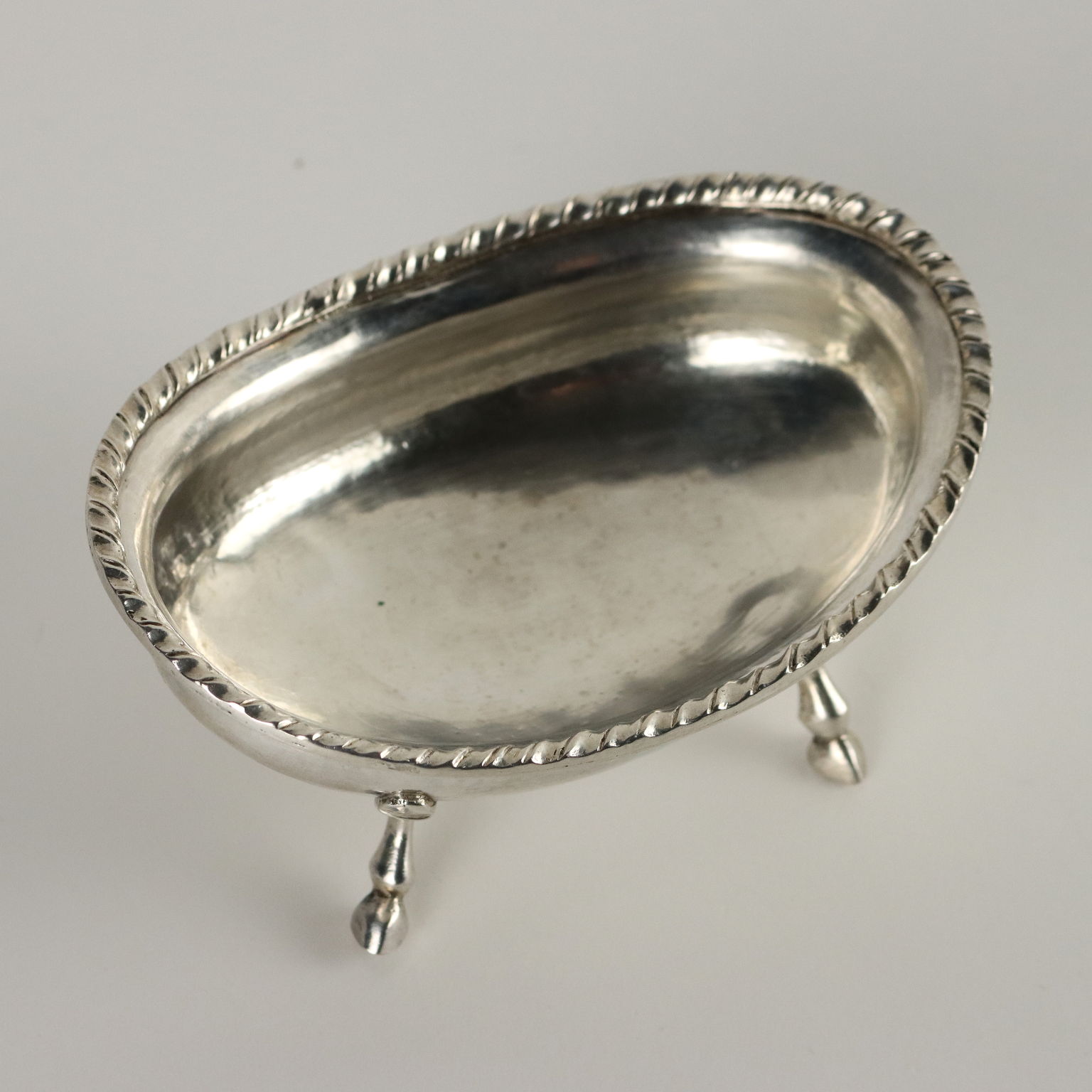 Silberner Salzstreuer mit länglicher Form, getragen von vier zoomorphen Füßen. 136 Gramm.