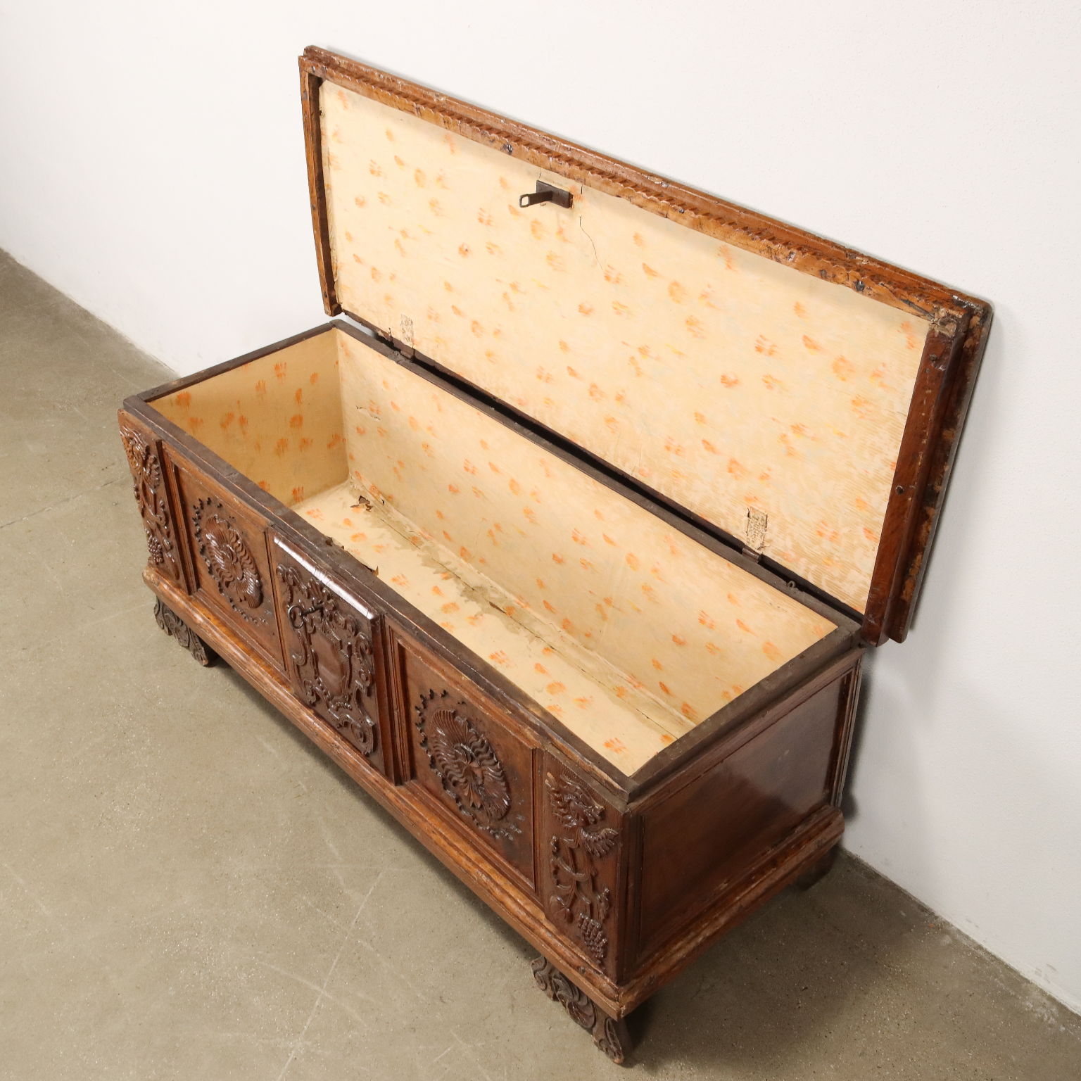 Barocke Truhe aus Bergamo-Produktion, sie wird von geschnitzten Doppelbügelfüßen getragen, die Vorderseite ist ebenfalls reich mit Schnitzereien verziert: großes zentrales Wappen, eingerahmt zwischen zwei Tafeln mit geometrischen Motiven und zwei seitliche Pilaster mit Engelsköpfen und phytomorphen Motiven. In Nussbaumholz mit Restaurierungen.