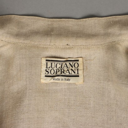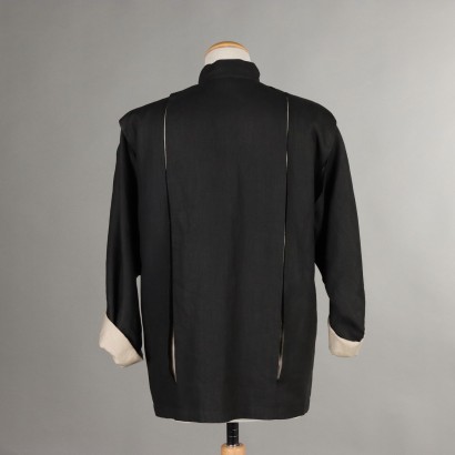 Soprani-Jacke aus den 80er Jahren aus Leinen mit Dreiviertelärmeln, schwarzer Außenseite und sandfarbener Innenseite. Die Passform ist weich und passt sich unterschiedlichen Größen entsprechend an: Die Länge beträgt 75 cm, die Taille 106 cm, die Schultern 44 cm. Sehr guter Zustand.