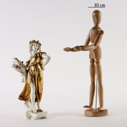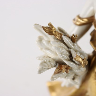 Weiße und goldene Porzellanfigur, die die Allegorie des Sommers darstellt. Unter dem Sockel befindet sich eine Manufakturmarke.
