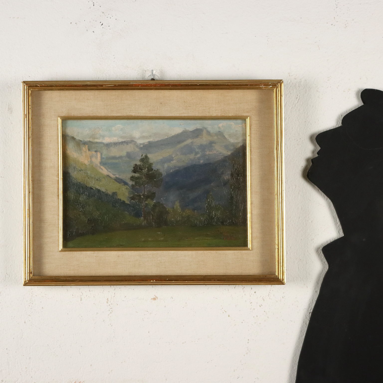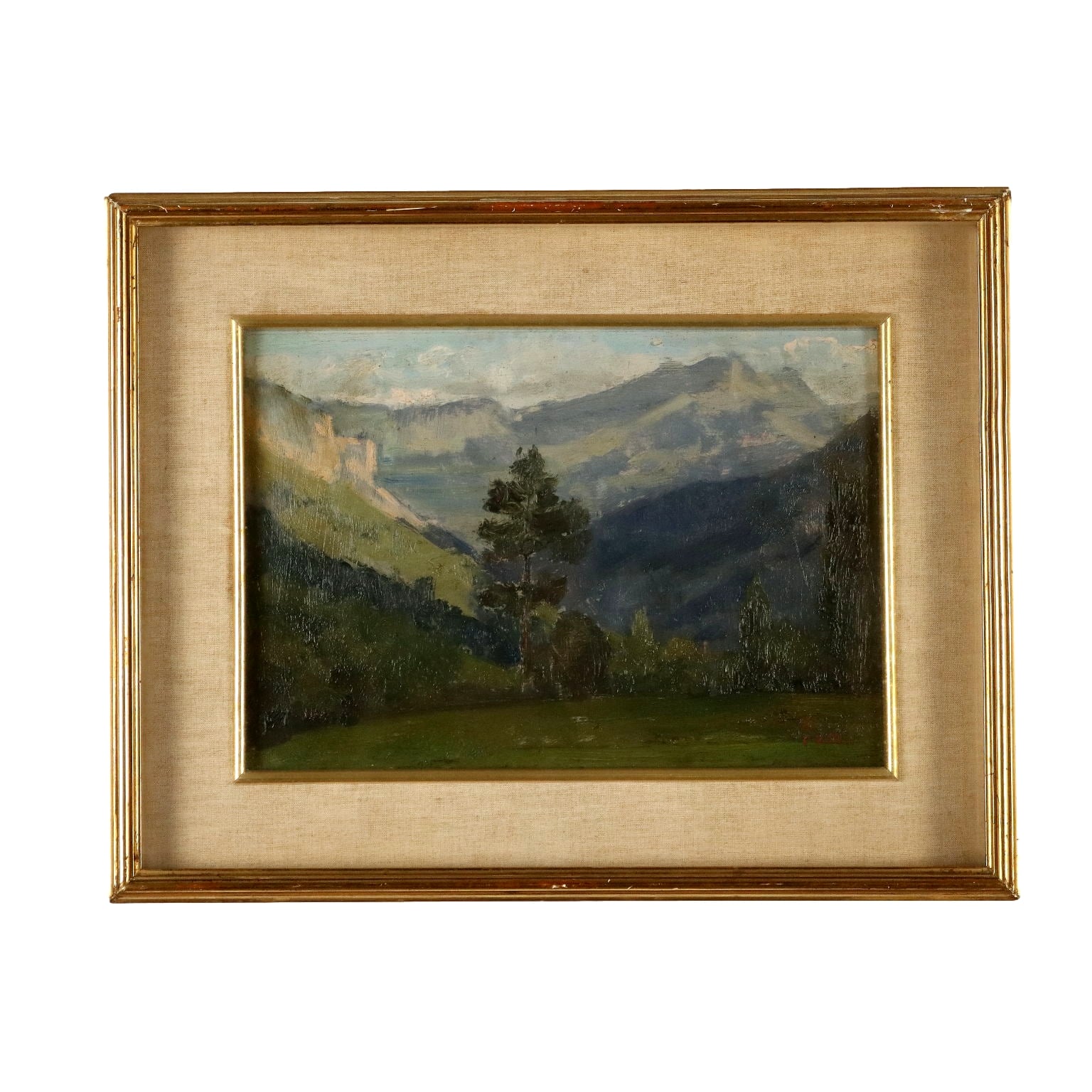 Öl auf Karton. Unten rechts signiert. Der Titel auf der Rückseite. Carlo Vittore, ein Landschaftsmaler aus Cremona, porträtierte hauptsächlich die Landschaften seiner Po-Ebene. Hier wird ein Blick auf die Berge des Aostatals geboten. Im Rahmen.