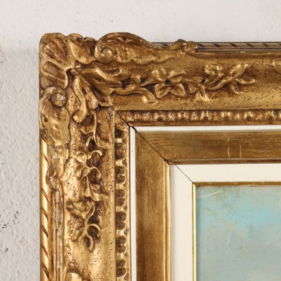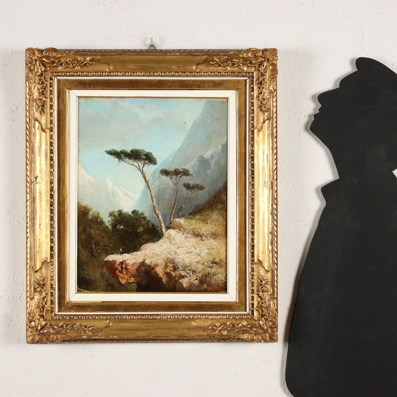 Öl auf Karton. Eindrucksvolle Aussicht auf die Berge, die einen felsigen und kargen Gipfel umrahmen, der von einigen in der Mitte emporragenden Kiefern überragt wird; Auf dem Felsvorsprung ist eine sehr kleine menschliche Figur zu erkennen, die die Landschaft betrachtet. im Hintergrund die schneebedeckten Gipfel, die in den Himmel übergehen. Das Gemälde wird in einem zeitgenössischen Rahmen präsentiert.
