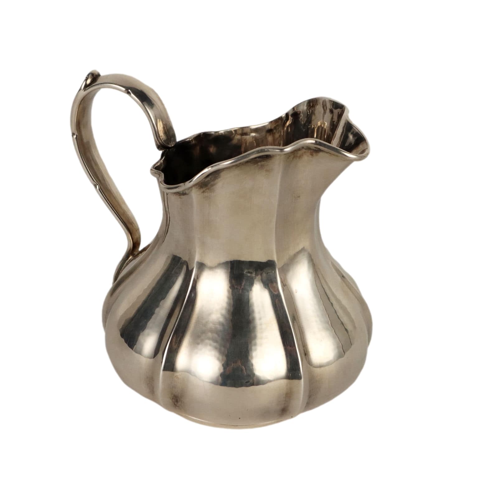 Von Hand gehämmerter und gehämmerter Silberkrug. Unter dem Sockel sind Silber- und Silberschmiedemarken eingraviert. Selbstklebendes Herstellungsetikett. 515 Gramm.