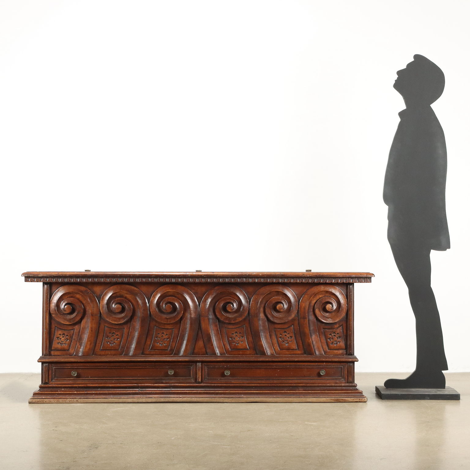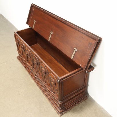 Stilkommode, im unteren Teil hat sie ein Paar Schubladen, auf der Vorderseite ist sie mit kräftigen Lockenschnitzereien verziert; in Mahagoni.