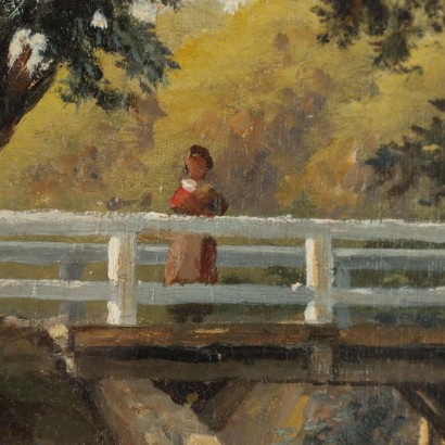 Öl auf Leinwand. Unten links signiert R. Grieben und datiert. Auf der Rückseite befindet sich am Rahmen eine Kartusche mit der Zuschreibung „Rosa Grieben decisit“ und Datierung. Der Blick auf die Landschaft umrahmt eine ruhige Ecke mit einer kleinen Brücke, die einen kleinen Bach überquert; eine weibliche Figur geht über die Brücke und blickt auf den Bootsmann, der unten auf dem Fluss landet; Auf der gesamten oberen Hälfte fällt das große Blattwerk einer Eiche auf. Das Werk wird in einem modifizierten und neu vergoldeten zeitgenössischen Rahmen präsentiert.