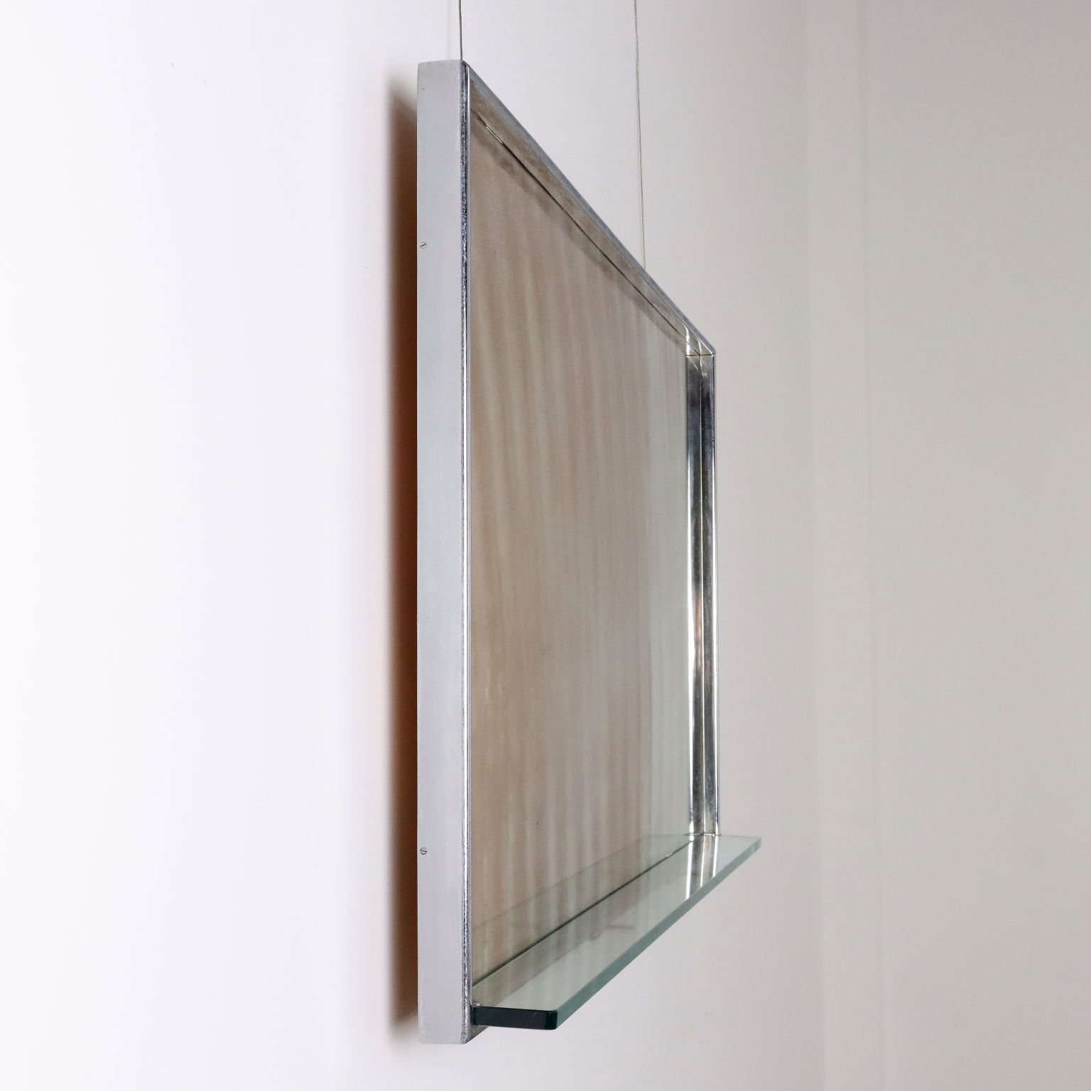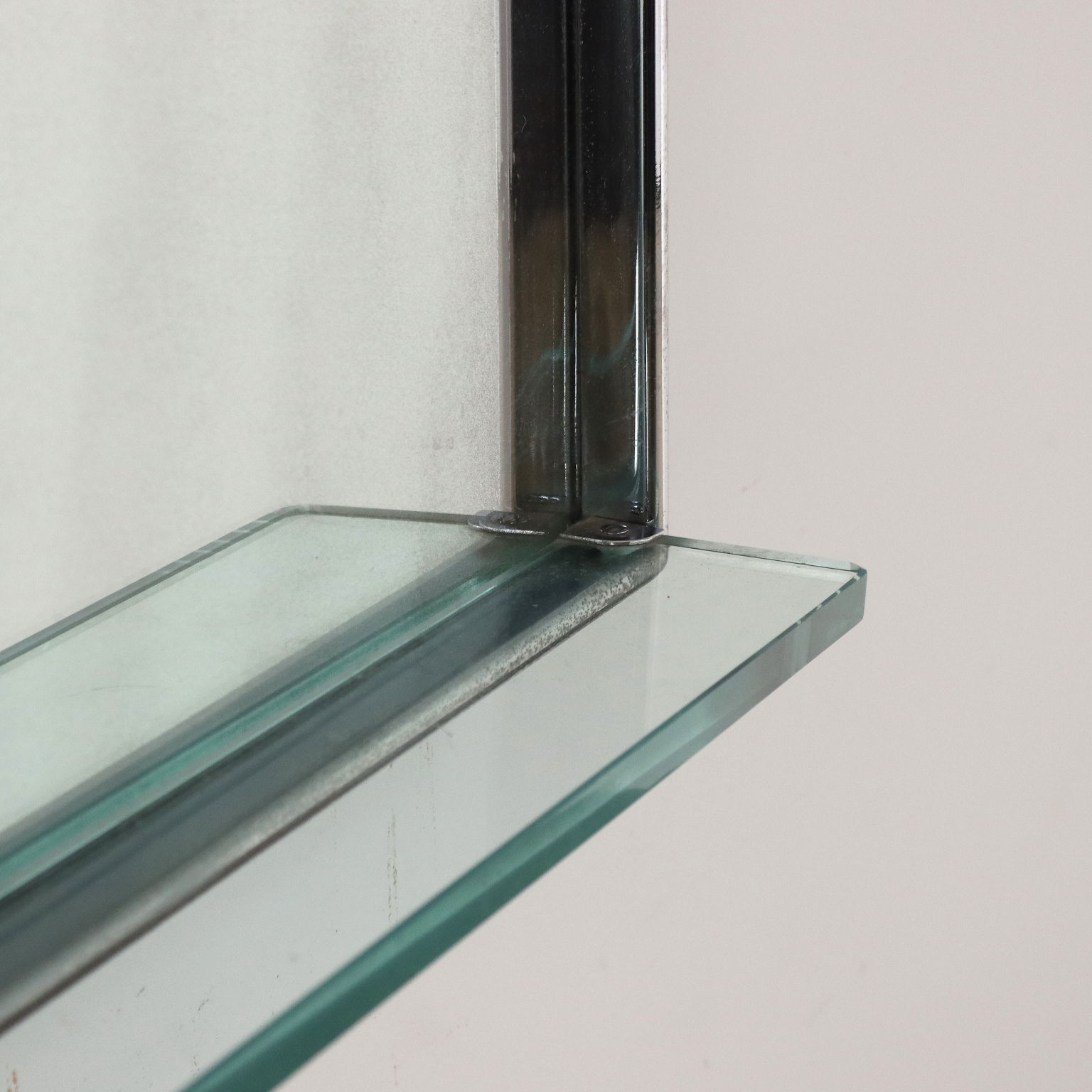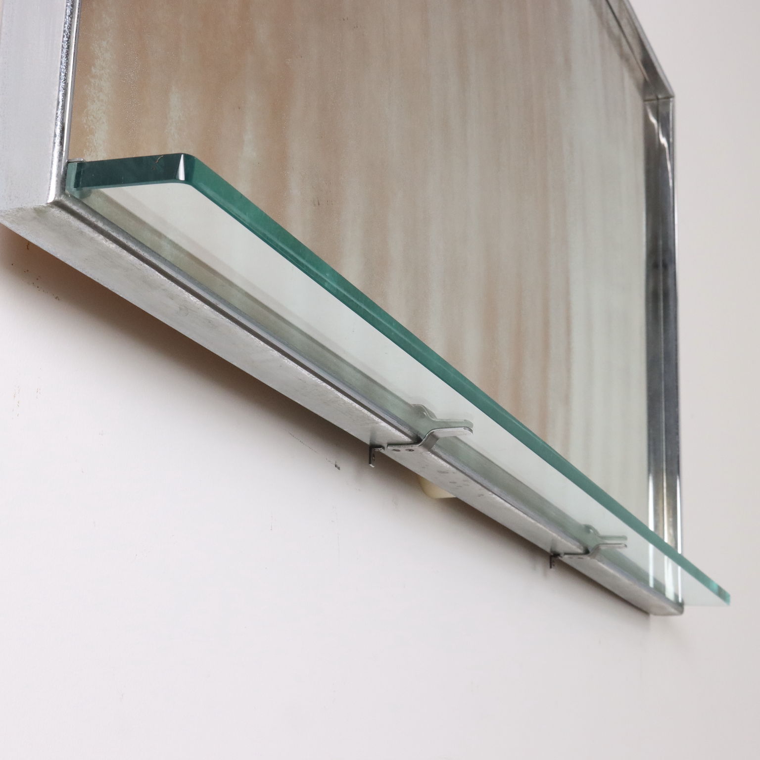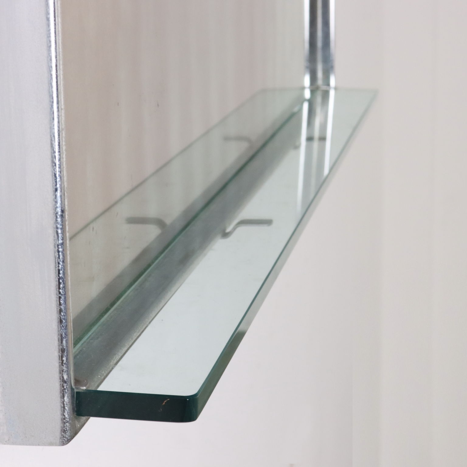 Wandspiegel, Rahmen aus verchromtem Aluminium, offenes Regal aus transparentem Glas, Spiegelglas.