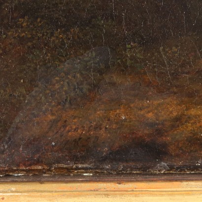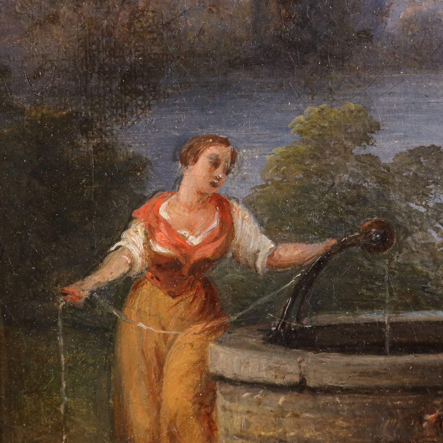 Öl auf Leinwand. Unten links signiert und datiert 1850. Die Landschaft bietet einen Küstenblick vom Land aus gesehen, mit einigen gemeinsamen Figuren rund um einen Brunnen, die die Landschaft selbst ergänzen, in die sie chromatisch gut integriert sind. Ferdinando Manzini war in seiner Heimatstadt Modena vor allem als Bühnenbildner und Dekorateur berühmt. Seine Malerei beinhaltete romantische Landschaften und Stillleben. Das restaurierte und unterfütterte Gemälde wird in einem vergoldeten Rahmen aus dem späten 19. Jahrhundert präsentiert.