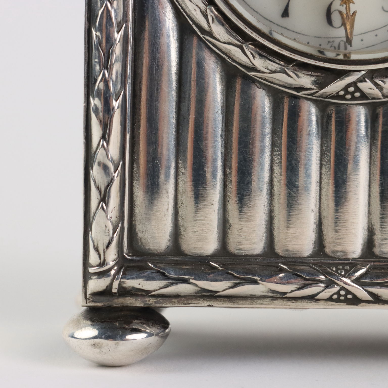 Silberne Tischuhr, emailliertes Zifferblatt mit arabischen Stundenzahlen. Unter dem Sockel eingravierte Silbermarken. Eingravierte Widmung nicht zeitgemäß. Ungefähr 200 Gramm.
