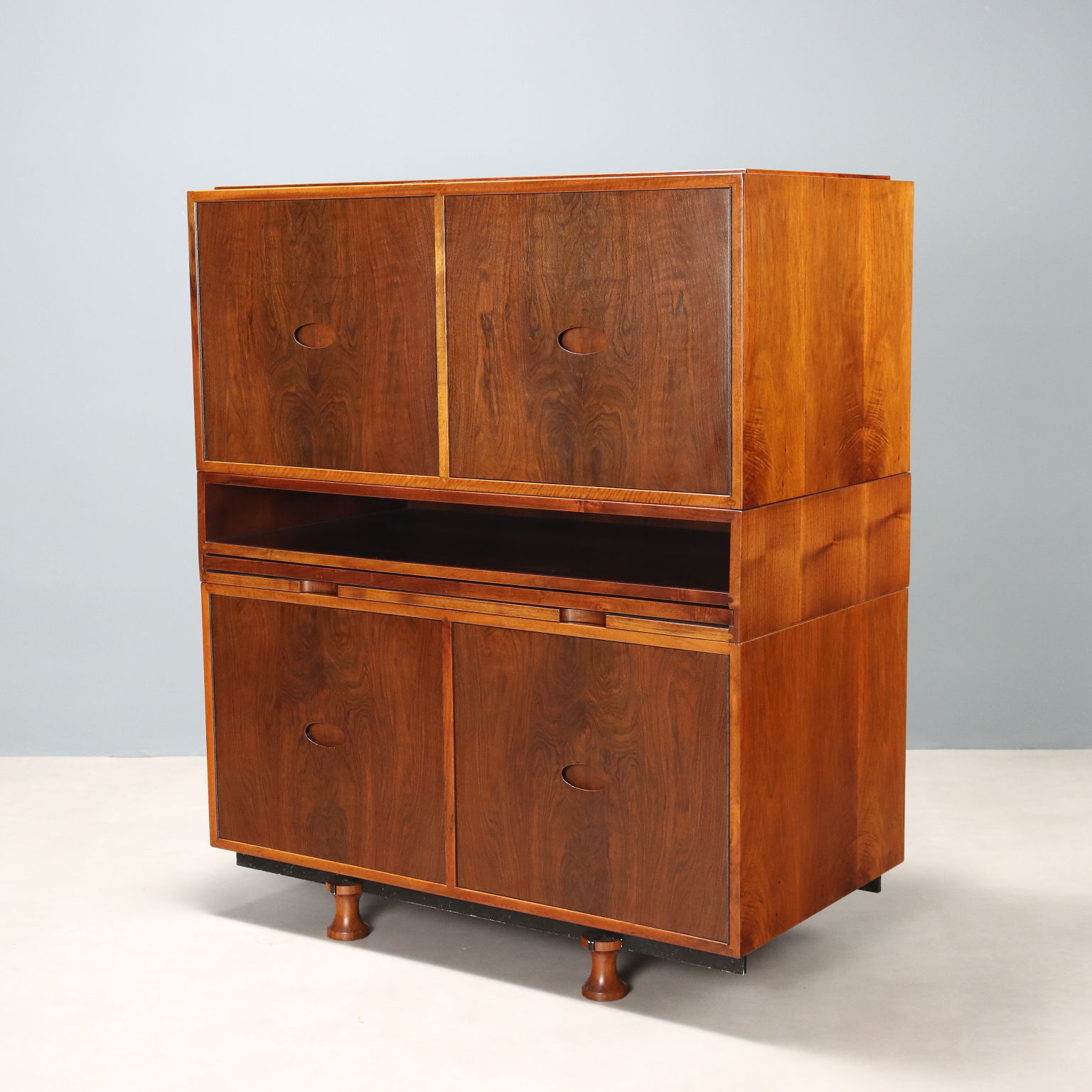 Vintage-Möbel aus Holz mit Edelholzfurnier, bestehend aus drei Modulen: zwei mit Flügeltüren und Innenregalen und eines mit offenem Fach und ausziehbarem Schreibtisch. Restauriert in unserer Werkstatt, mit Herstelleretikett. Sehr guter Zustand.