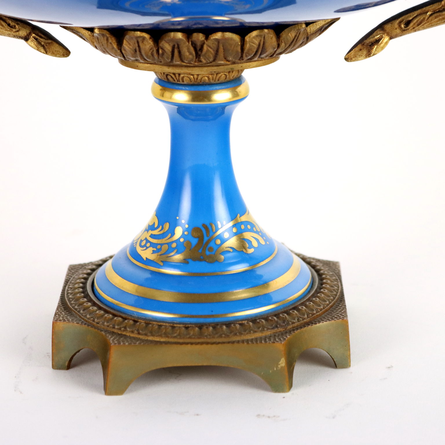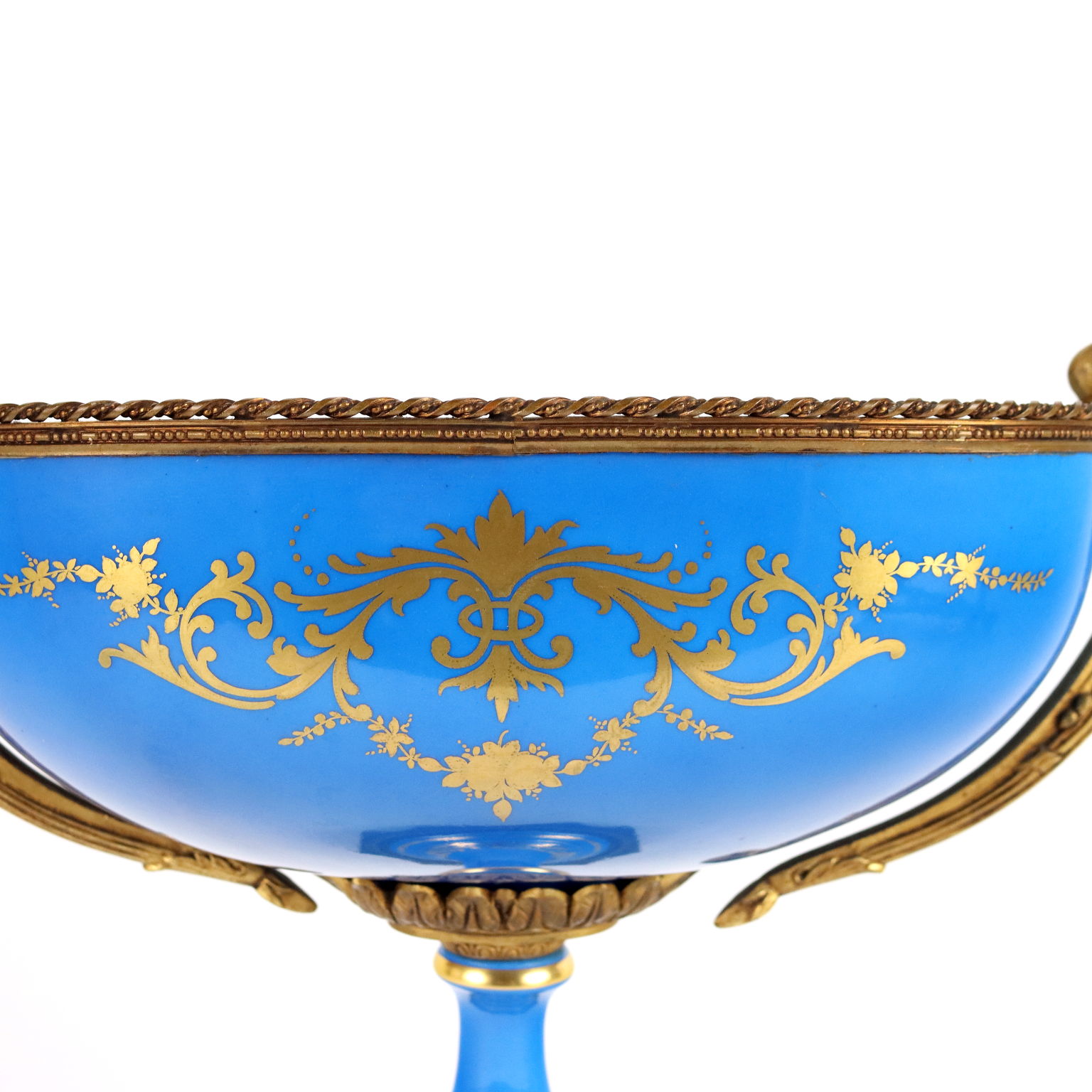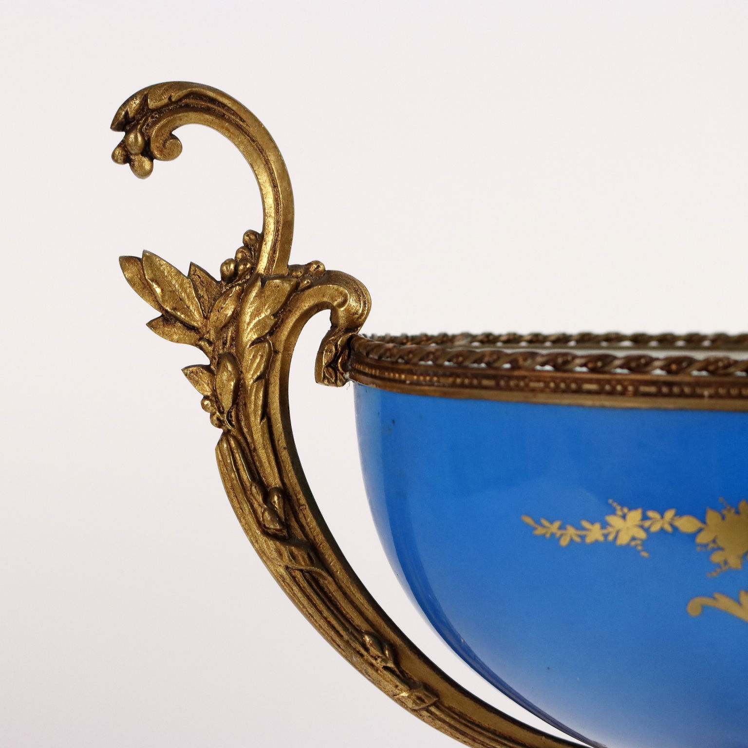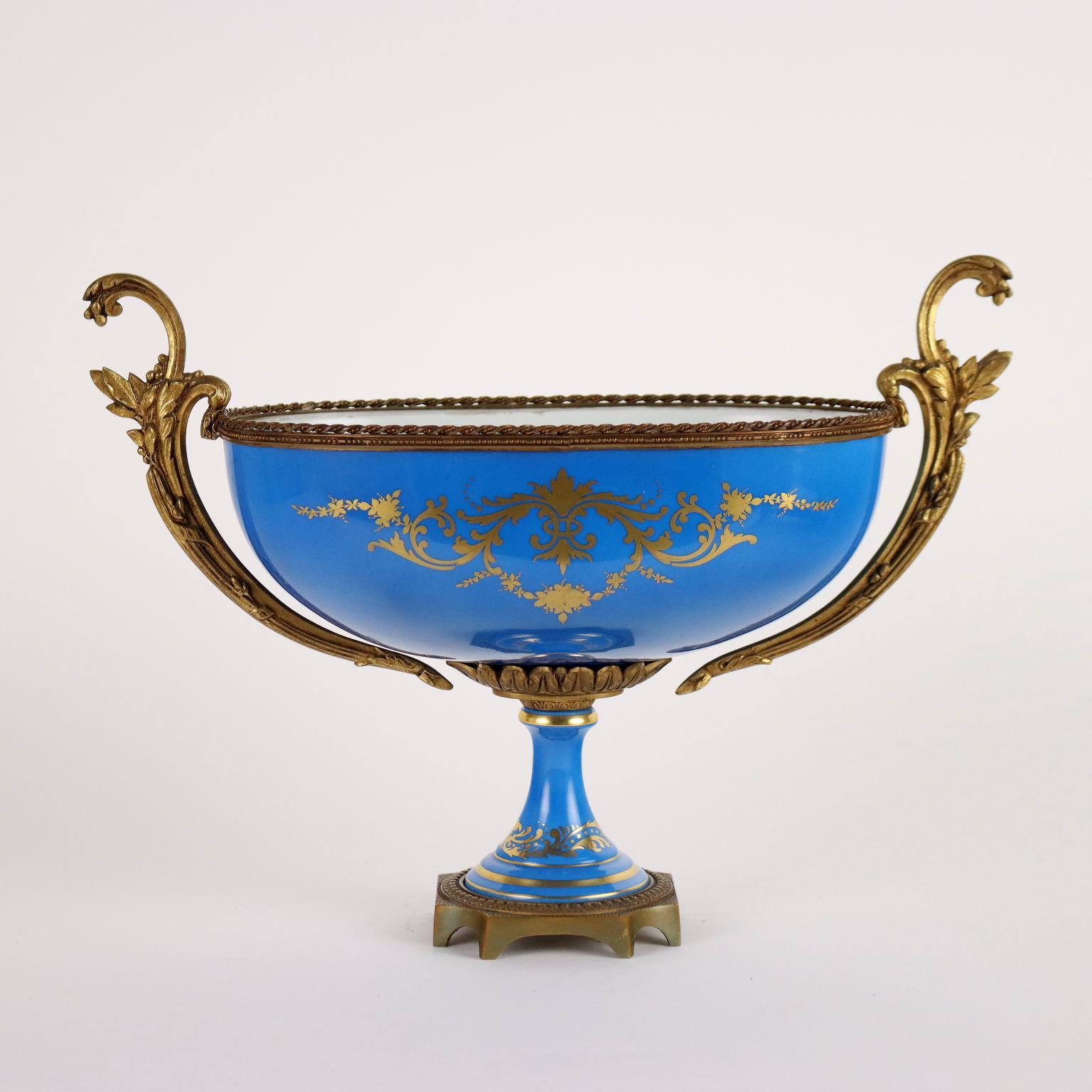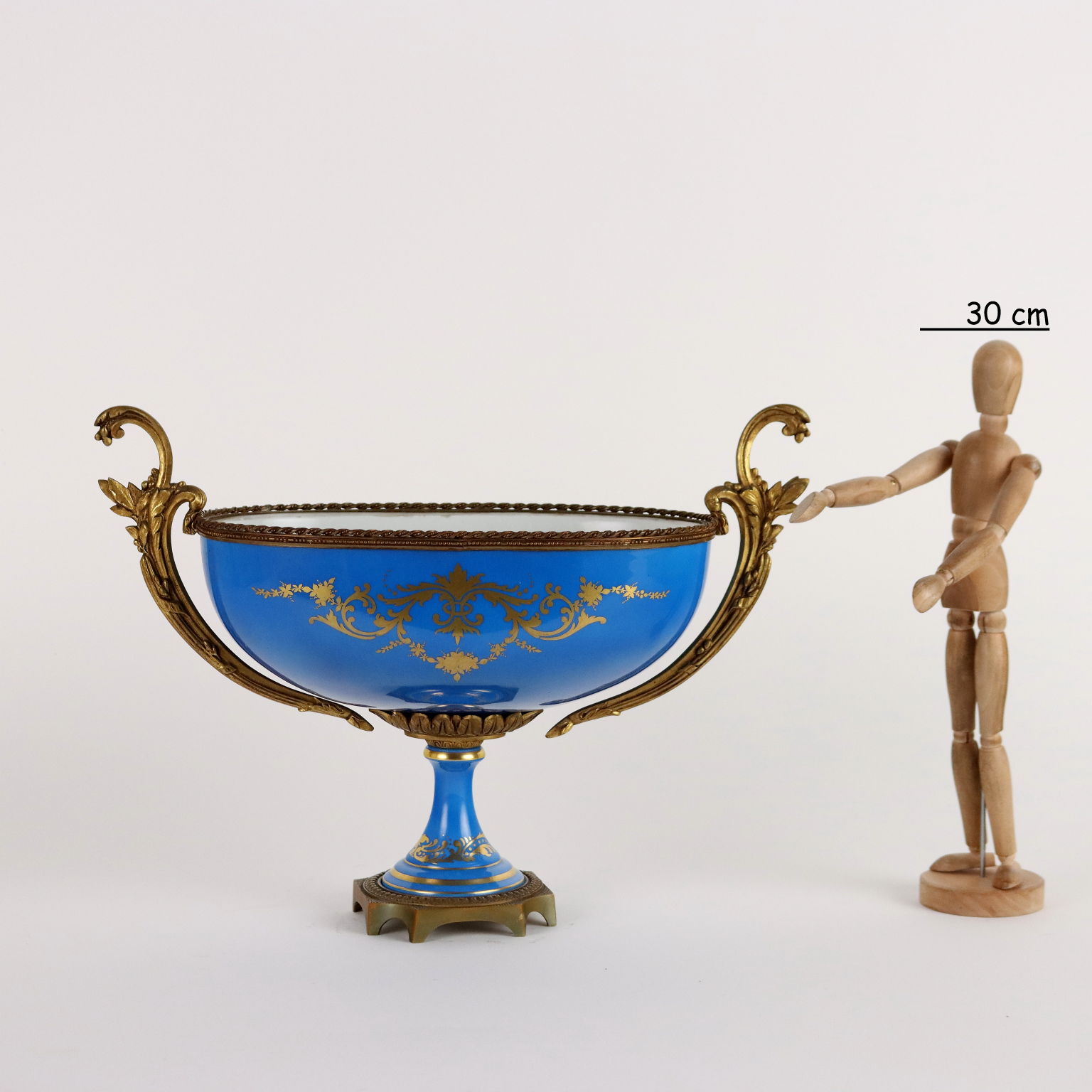 Tafelaufsatz aus Sèvres-Porzellan auf Bronze montiert mit seitlichen Griffen. Vor einem blauen Hintergrund heben sich die Golddekorationen mit Blattranken und Pflanzenmotiven ab, während im Inneren der Reserve und der Tasse vielfarbig gemalte Blumensträuße zu sehen sind. Herstellermarke unter dem Sockel.