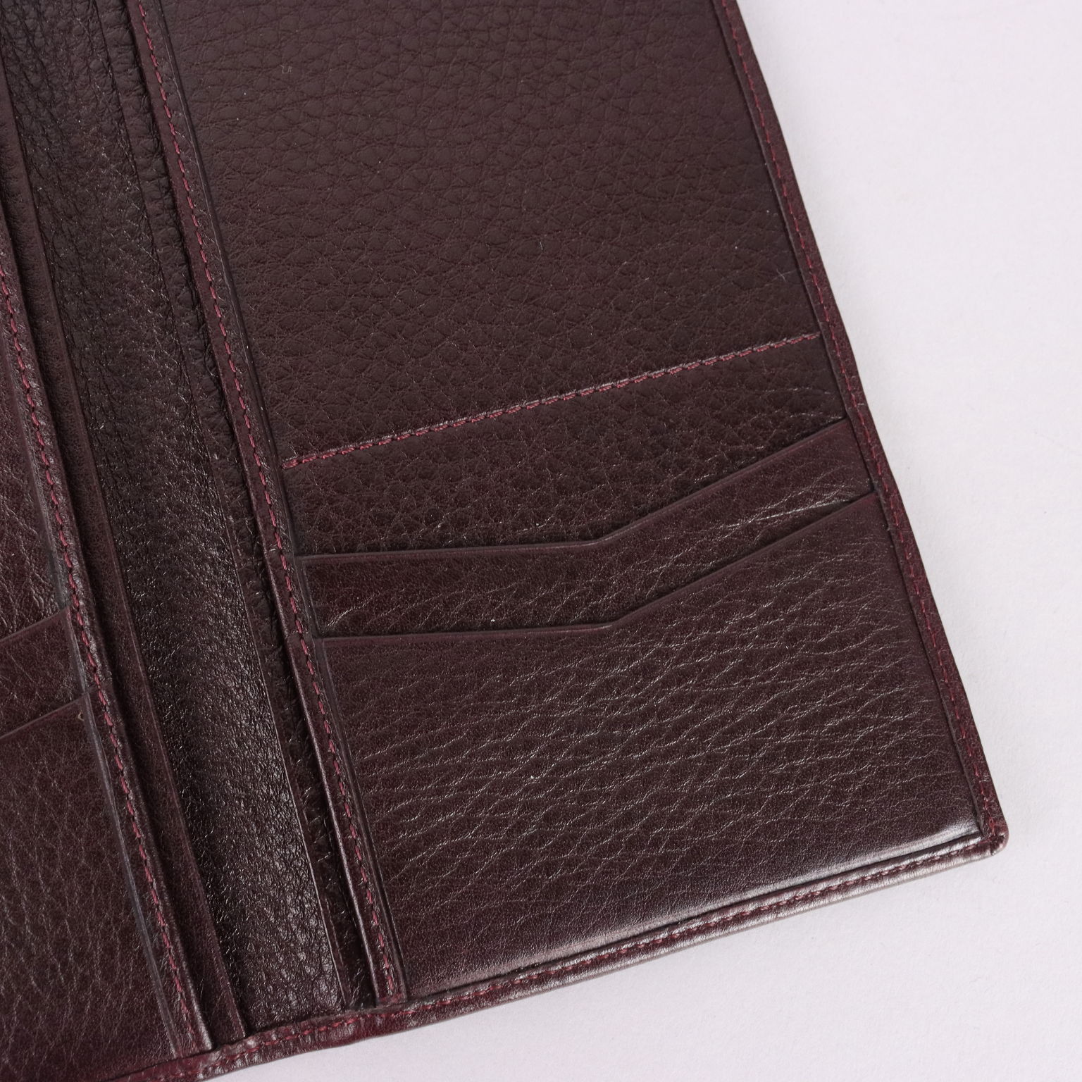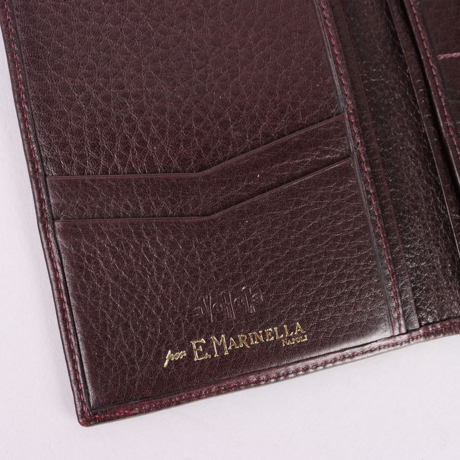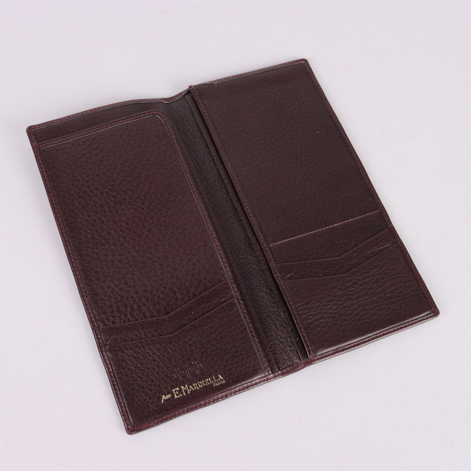 Lange Geldbörse aus sehr weichem, gehämmertem Leder in Burgunderrot, hergestellt von der bekannten italienischen Marke Vitale Barberis Canonico für E. Marinella. Aufgeteilt in verschiedene Fächer und Taschen. Im rechten Bereich ist ein kleiner Riss zu erkennen.