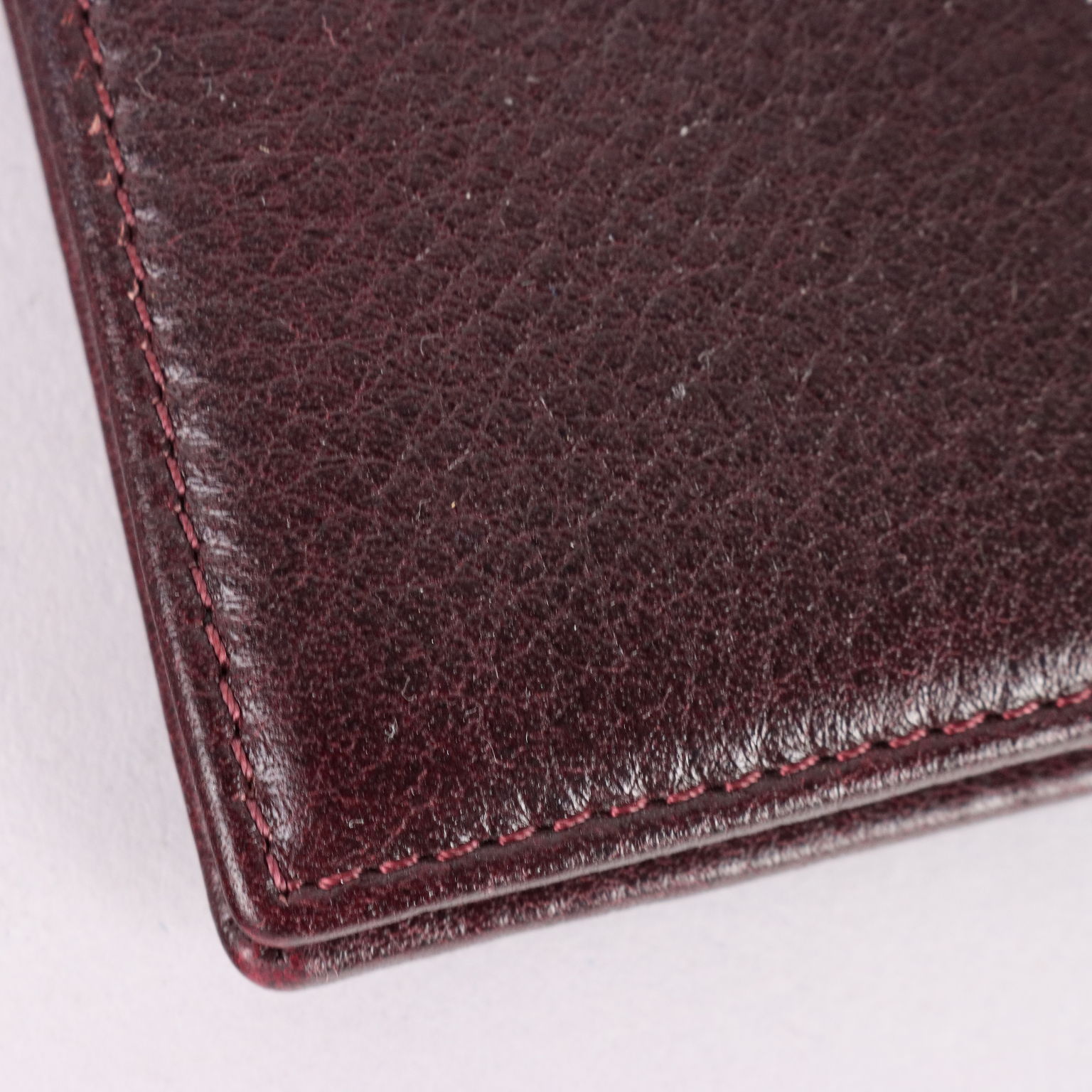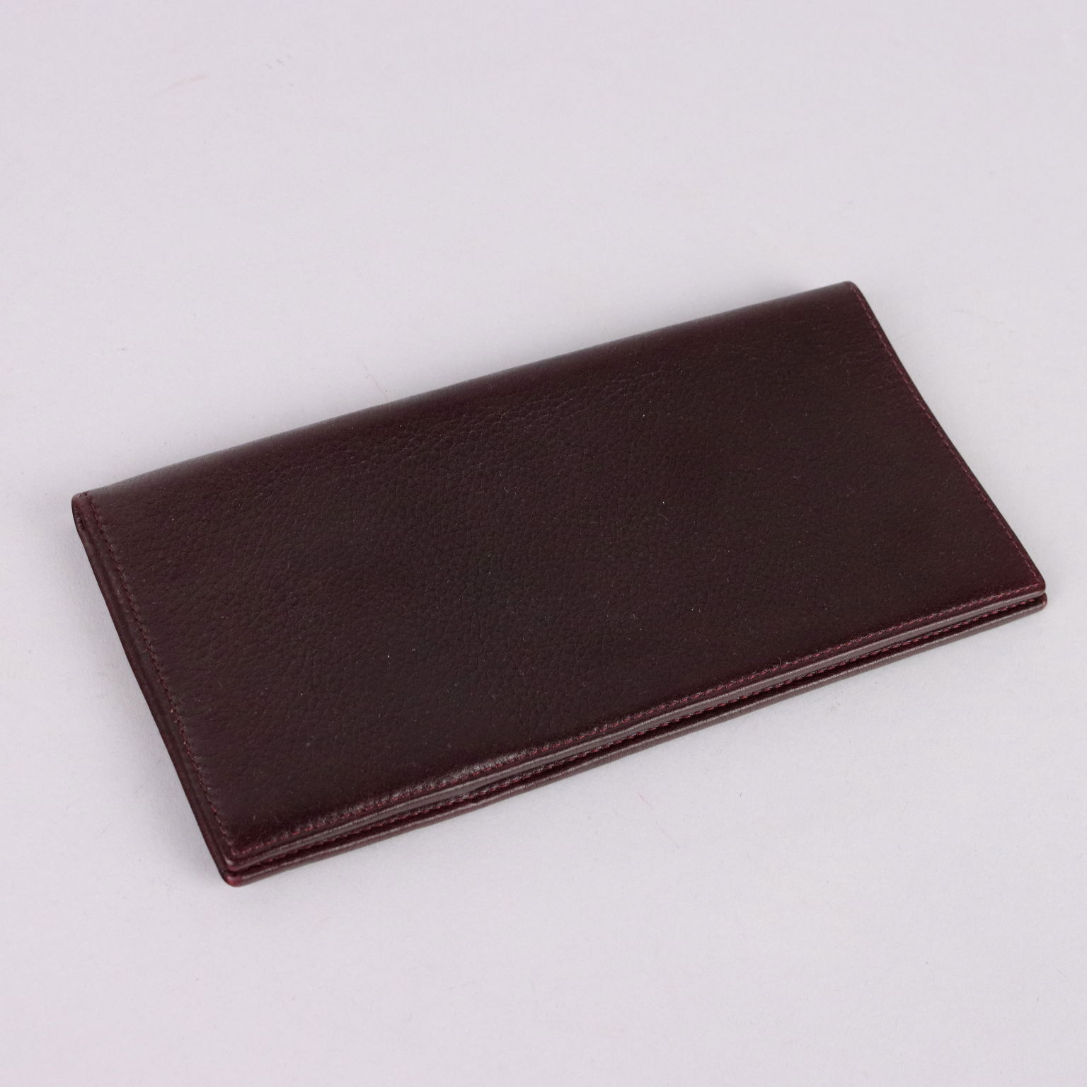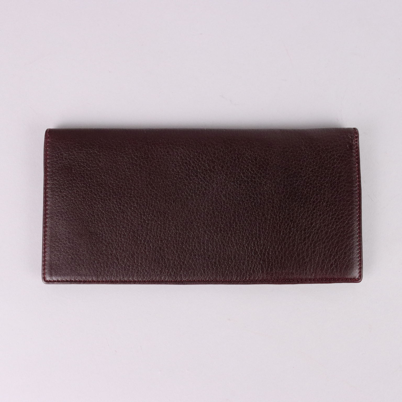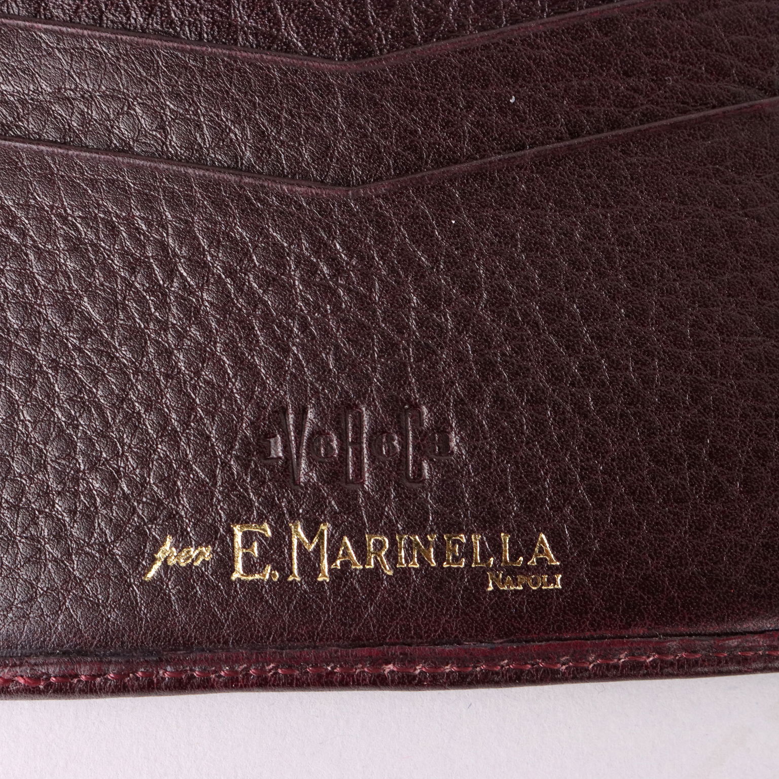 Lange Geldbörse aus sehr weichem, gehämmertem Leder in Burgunderrot, hergestellt von der bekannten italienischen Marke Vitale Barberis Canonico für E. Marinella. Aufgeteilt in verschiedene Fächer und Taschen. Im rechten Bereich ist ein kleiner Riss zu erkennen.