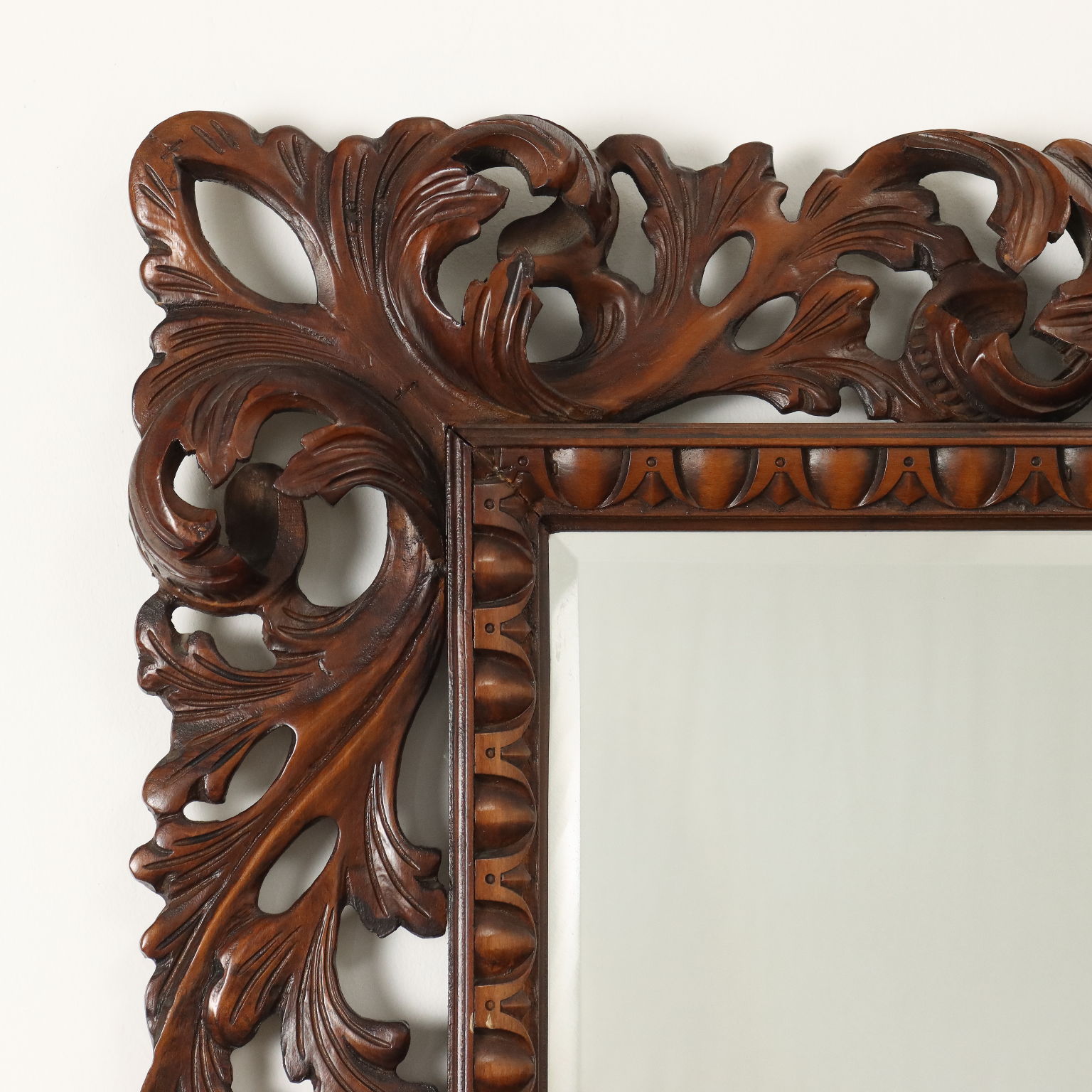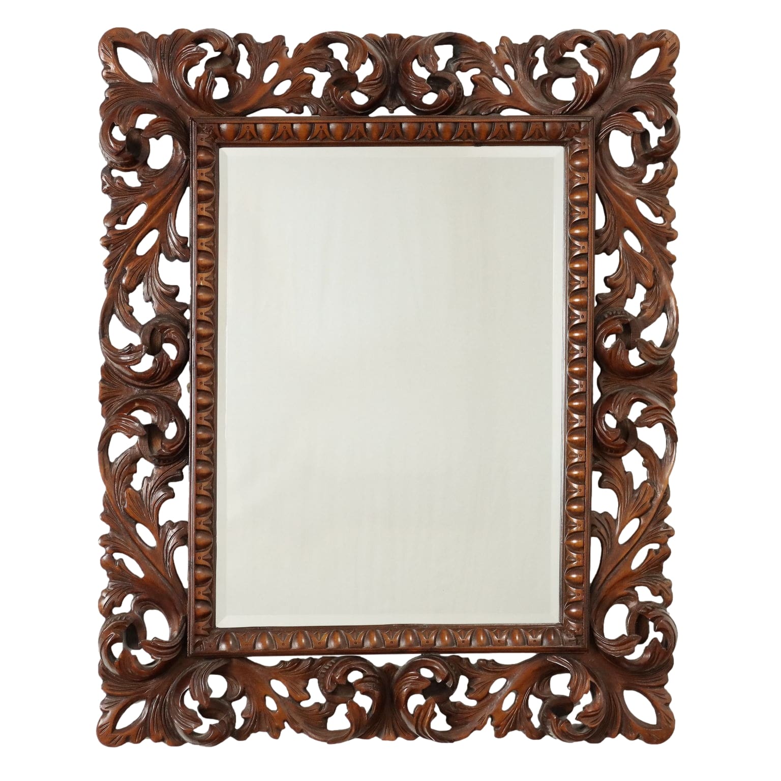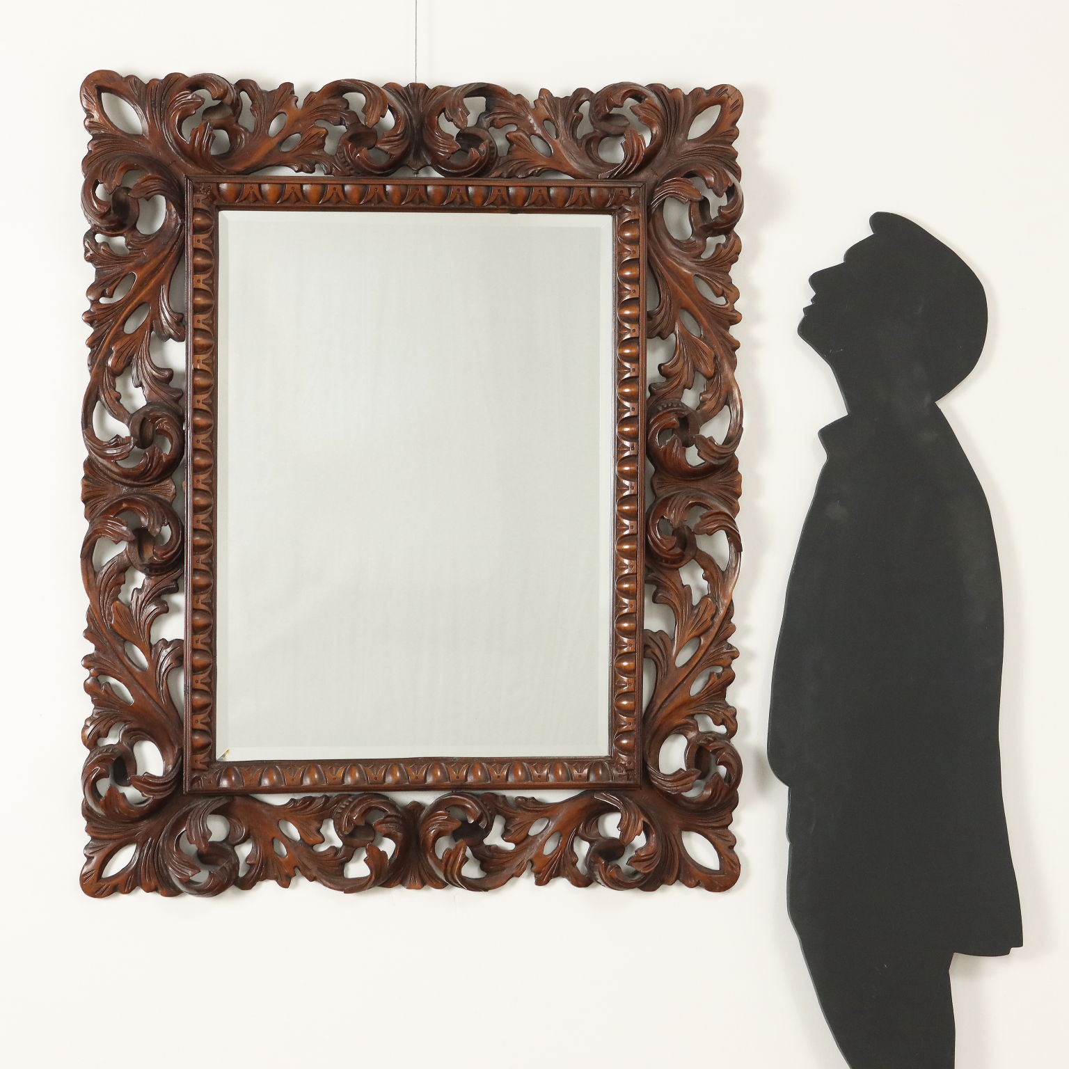 Spiegel aus Lindenholz, nussbaumfarben gebeizt, perforiert, mit Blattschnitzereien im Barockstil. Italien, 20. Jahrhundert.