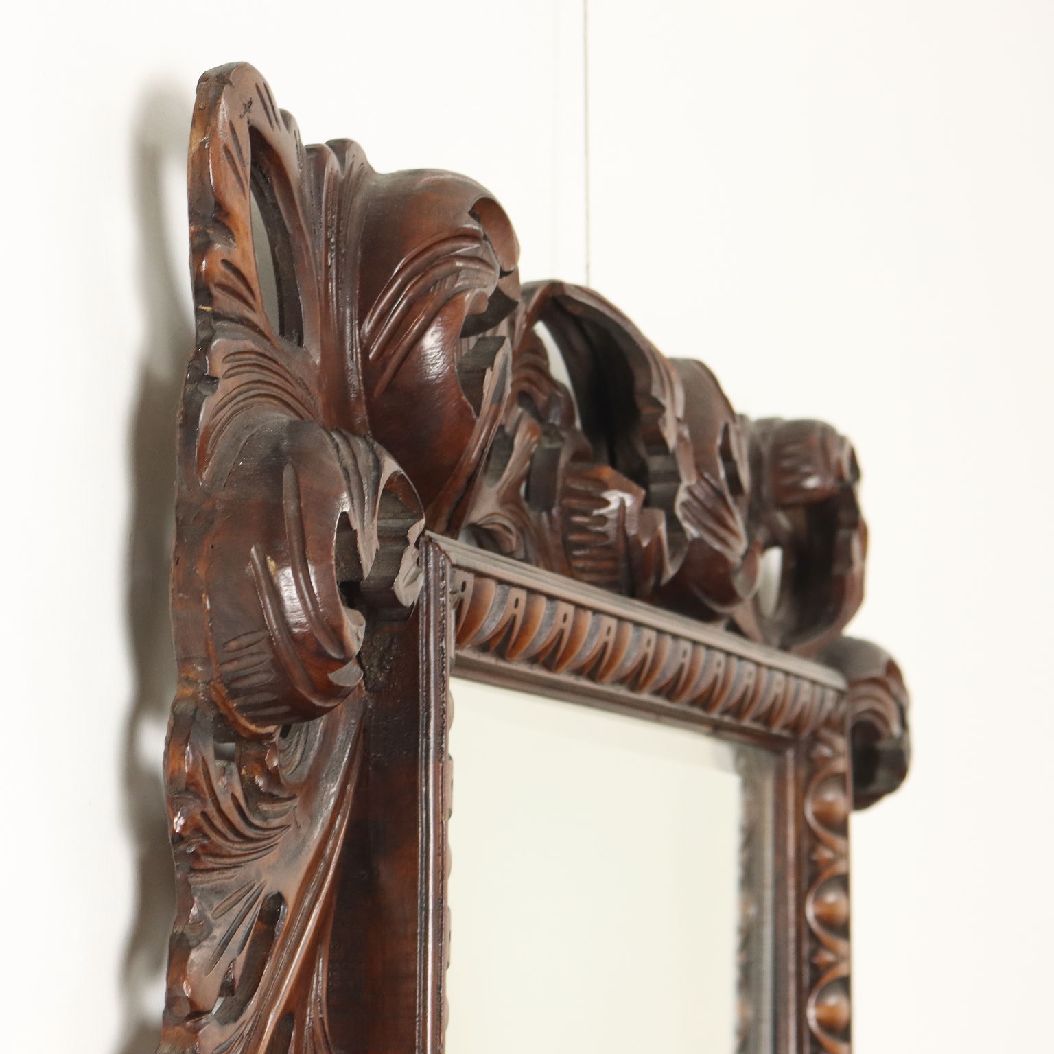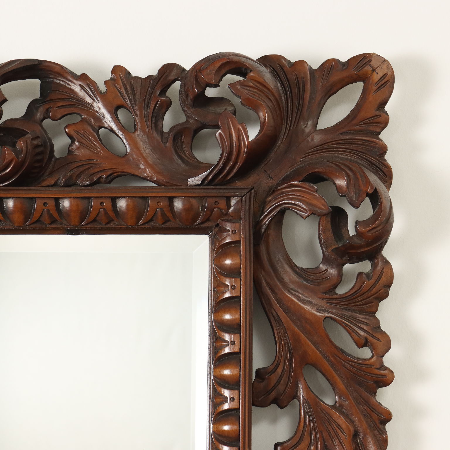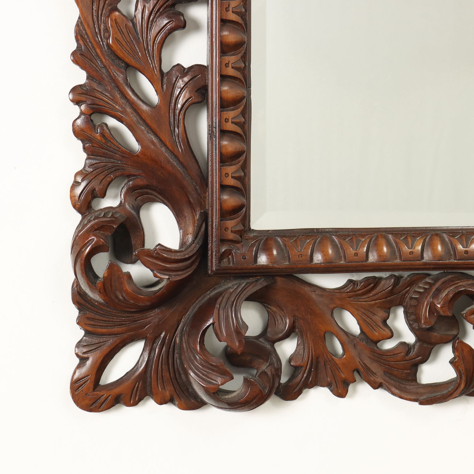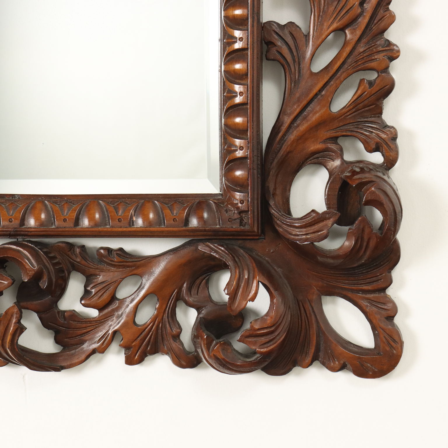 Spiegel aus Lindenholz, nussbaumfarben gebeizt, perforiert, mit Blattschnitzereien im Barockstil. Italien, 20. Jahrhundert.