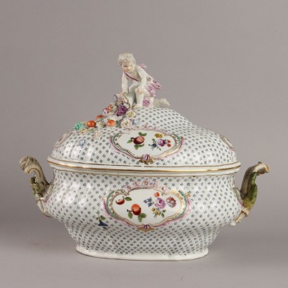 Ovale Suppenterrine mit zwei geschweiften Henkeln, Deckelgriff in Form eines Cherubs, der aus einem Füllhorn kleine Blumen und verstreute Früchte ausgießt. Der gesamte Körper und der Deckel sind mit einem Motiv aus stilisierten Blumen verziert, die in einem Gittermuster angeordnet sind. Auf weißem Grund sind Reserven mit Blumen- und Früchtebouquets zu sehen. Kantenhighlights in reinem Gold.