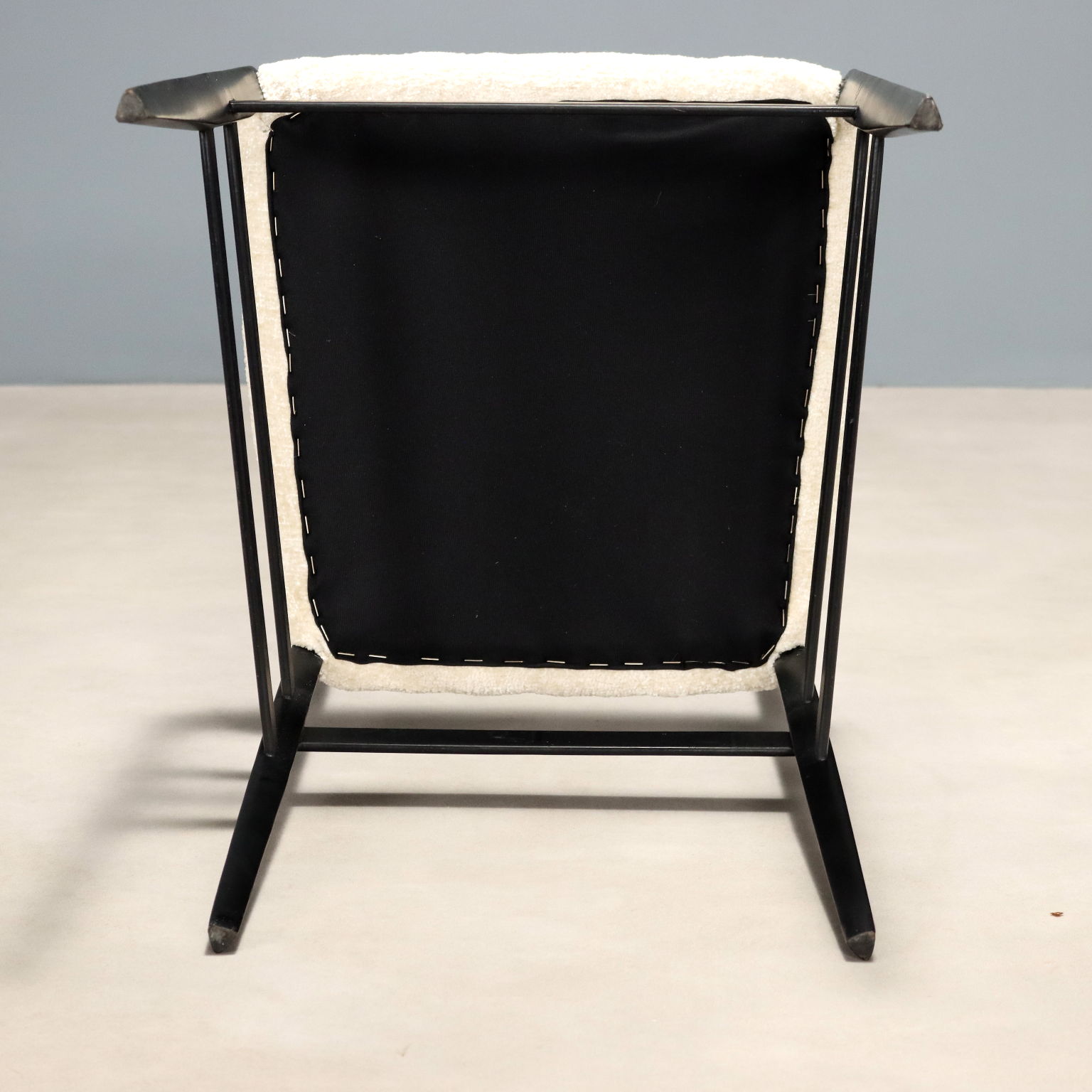 Esszimmerstuhl-Set mit schwarz emailliertem Holzrahmen, Sitzfläche mit weißem Stoffbezug.