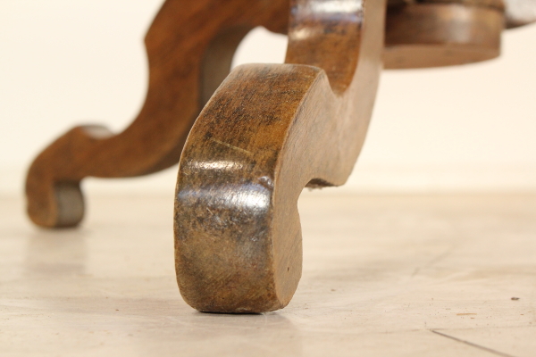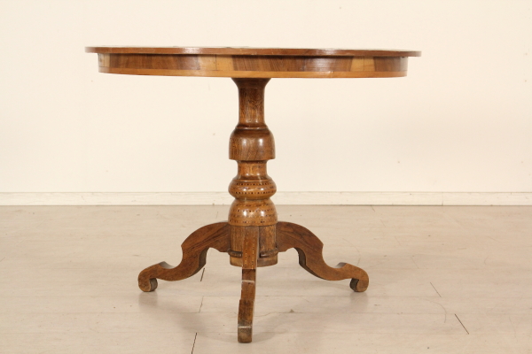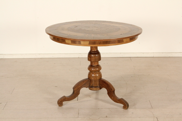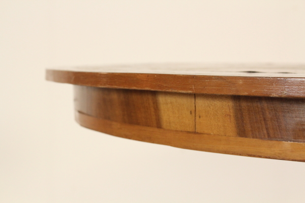 Runder Couchtisch eingelegt. Unterstützt durch Baluster wandte sich Beine beenden in Zügen Fäden eingelegt haben. Runde Spitze mit geometrischen Intarsien und Inlay, St. Georg und dem Drachen darstellen.