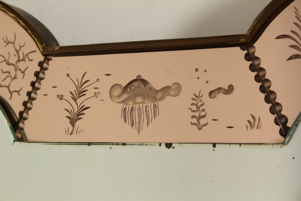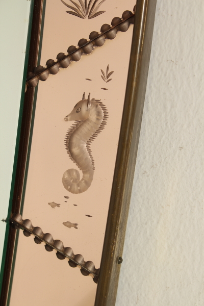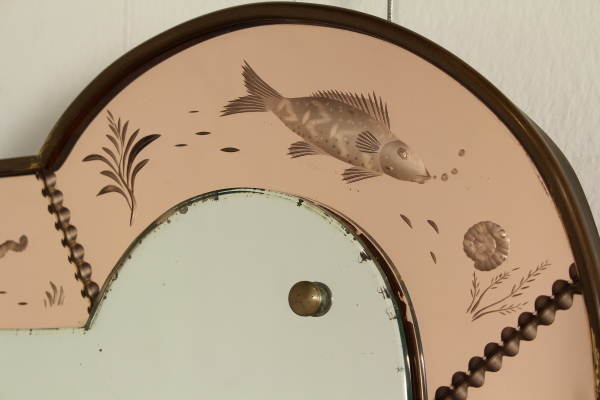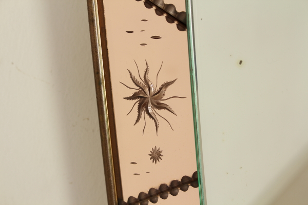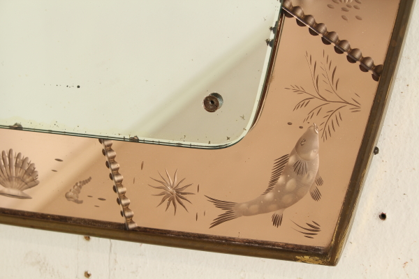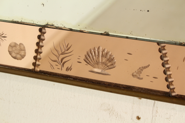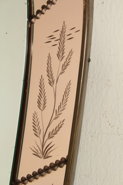 Montiert auf einen Holzrahmen Wandspiegel Rahmen und dekorierten Glasmalerei, Messing. Guter Zustand, zeigt wenig Anzeichen von Verschleiß.