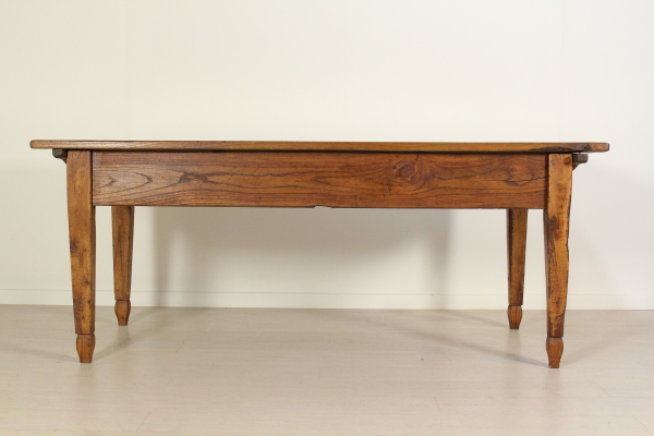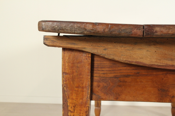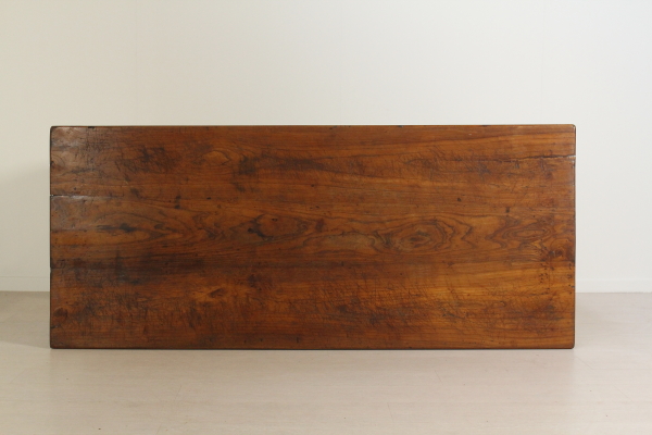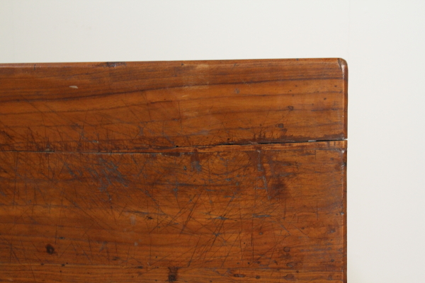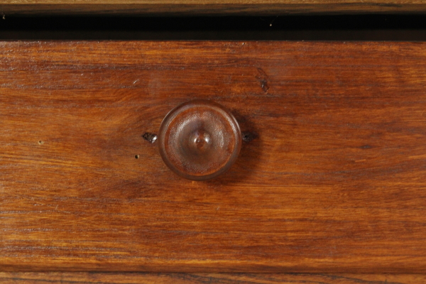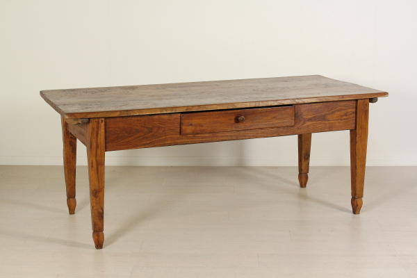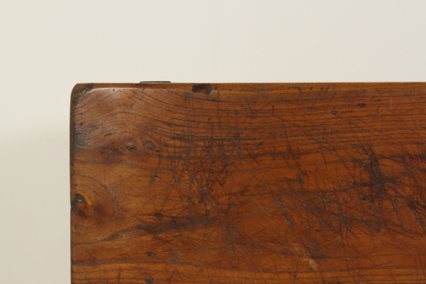 Tisch mit Schublade. Unterstützt durch Beine in abgeschnittenen pyramidale Nussbaum mit Glas hat hohe Seiten mit Schublade. Sie sind mit Traversen geformt für die Befestigung mit hölzernen Steckern in Elm-Plan festgelegt.