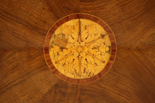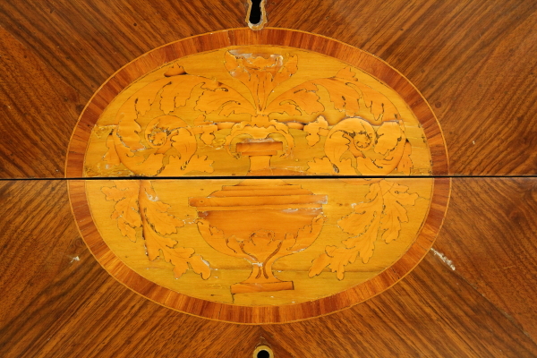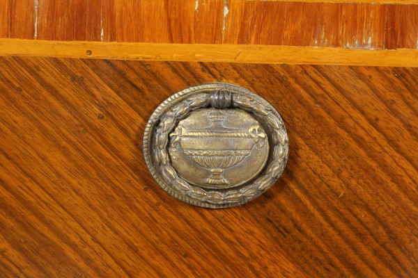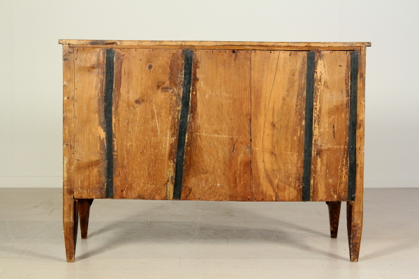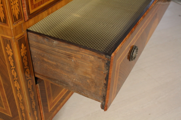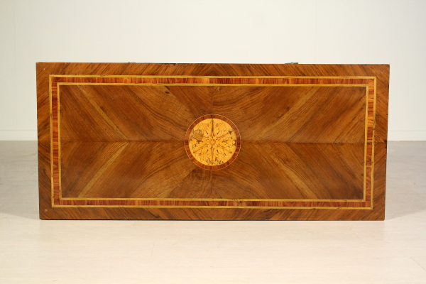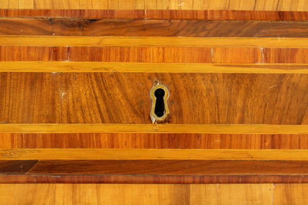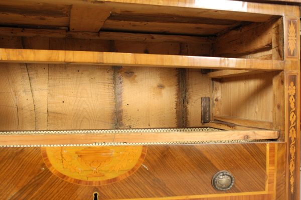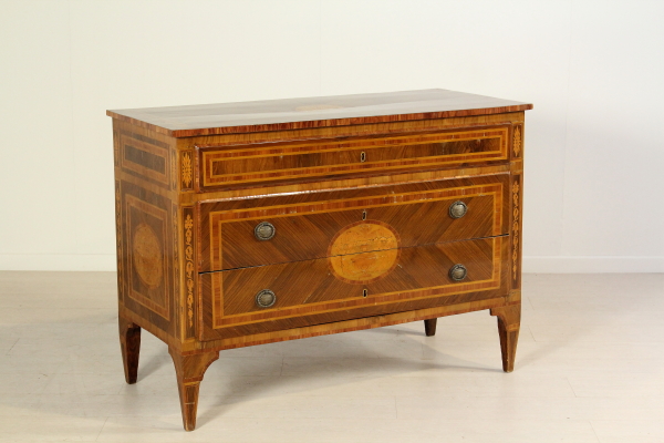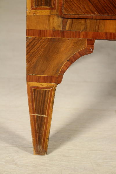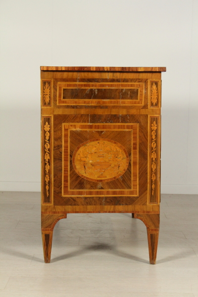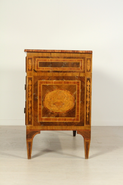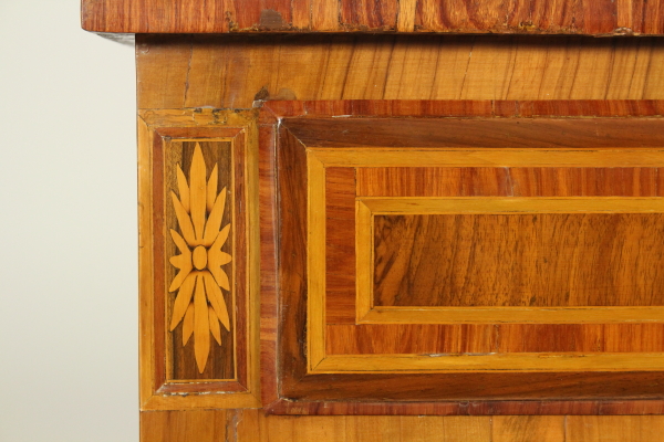 Drei Schubkästen Kommode die ersten kleinsten Subgrade. Die untere Schublade hat zweiseitigen Lastronatura aus Nussbaum mit eingelegten zentrale Rosette, Blumenvase, hergestellt aus Ahorn und Buchsbaum.Geformte Schublade trim in Bois De Rose. Hagebutten mit vierseitigen Reserven und zentrale Fensterrose. Auf den gleichen Plan Lastronatura mit eleganten inlay foliaceous zentrale Fensterrose. Eingelegtes Pfosten. Troncopiramidfali Füße. Zeitgenössische sperren.