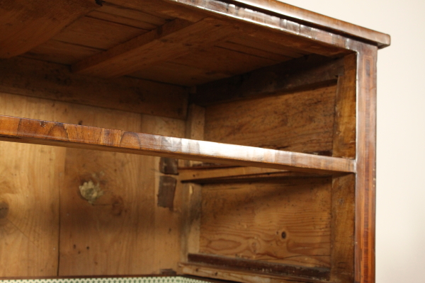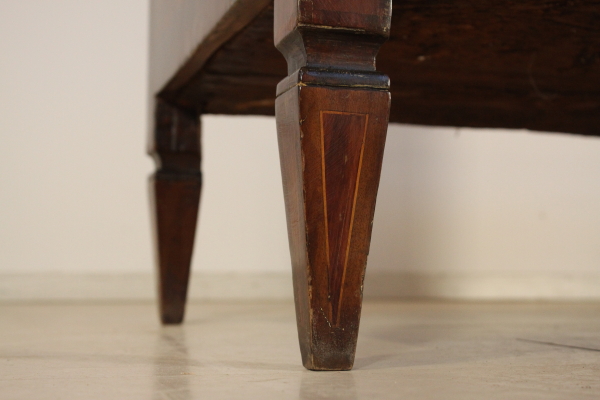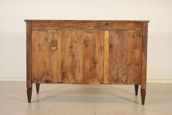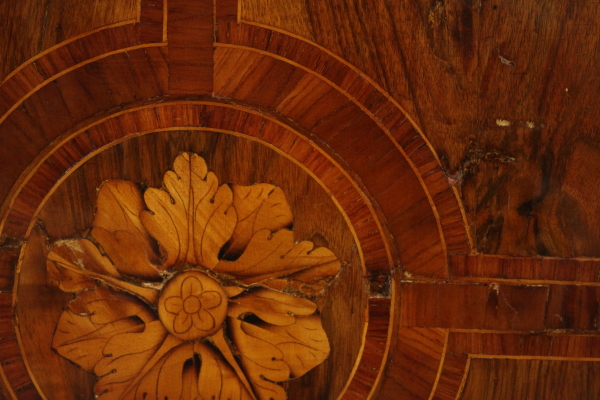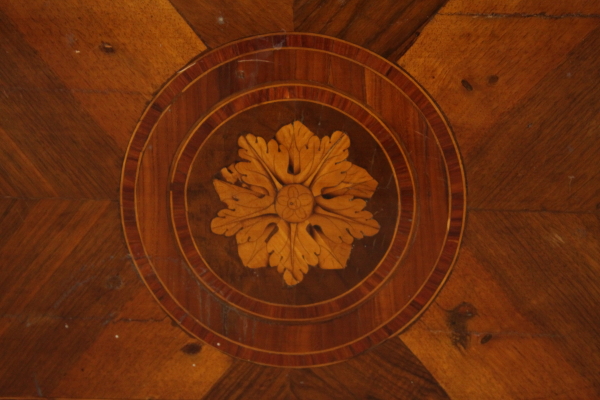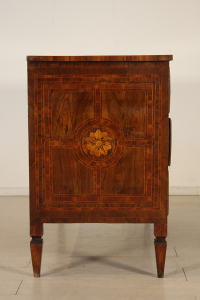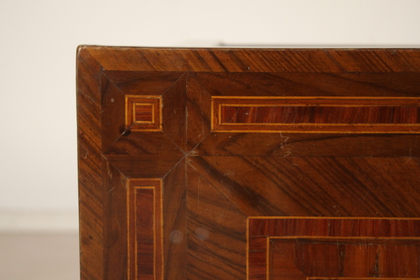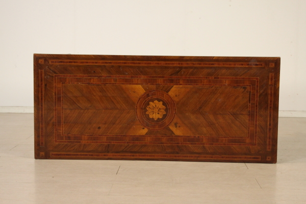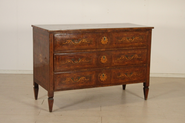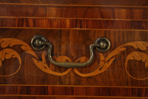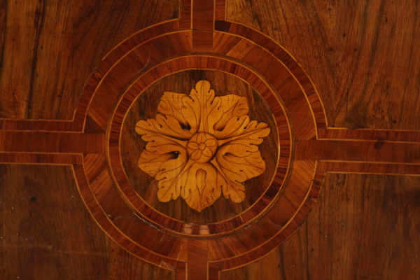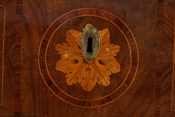 Drei Schubladen mit Schublade über die gesamte Fläche präsentiert drei Ordner davon zweiseitigen Runde Central, mit Walnuss unten behält sich vor, Fäden in Bois De Rose, verschiedenen Essenzen und Fogliacei Inlays. Eingelegtes Rosen mit Blättern von Acento, abgeschnittene Pyramide Füße mit Kragen. Zeitgenössische sperren, innen Fichte.