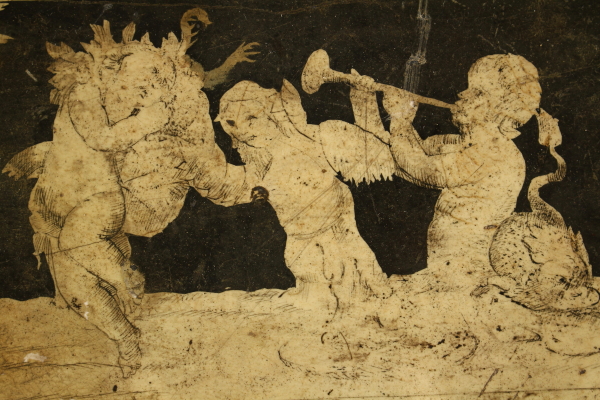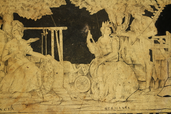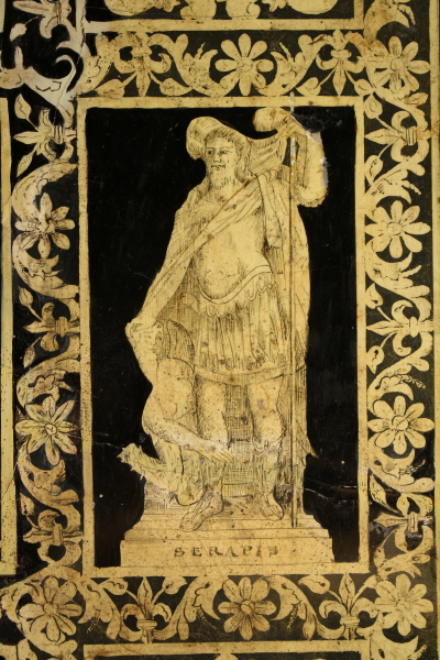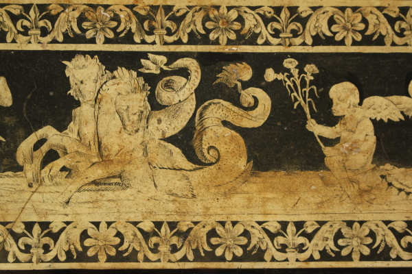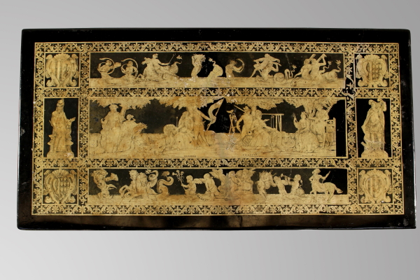Couchtisch zugeschrieben Simone Setti (Nachrichten in 1659, 1666, 1668), planen Sie ein Schüler von Modena Gavignani und eines der bekanntesten Scagliolists-Carpigiani. Der Plan auf einem dunklen Hintergrund hat einen breiten Rahmen Ränder mit edlen Wappen in den Ecken auf die Seiten zwei Zahlen, die Drucke, die Darstellung der griechischen Götter und Aruspice in Spielen von Wassermännern und Meerjungfrauen Putten entnommen. In der Mitte hat das Hauptbild die Symbolfiguren von Italien, Spanien, Deutschland und Frankreich und ihre Einträge.
