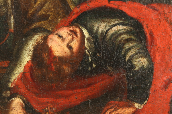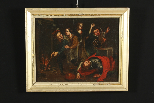 Taverne-Szene. Öl auf Leinwand, vermutlich Frankreich. drei Männer in plötzlichen Schlägerei verwickelt, und zwei Frauen versuchen, die Gemüter zu beruhigen. gute Qualität kleinen Bankett-Tisch und das Spiel der Reflexionen des Feuers; Reintelato, bereits im Rahmen präsentiert ' Golden 800-Mekka.