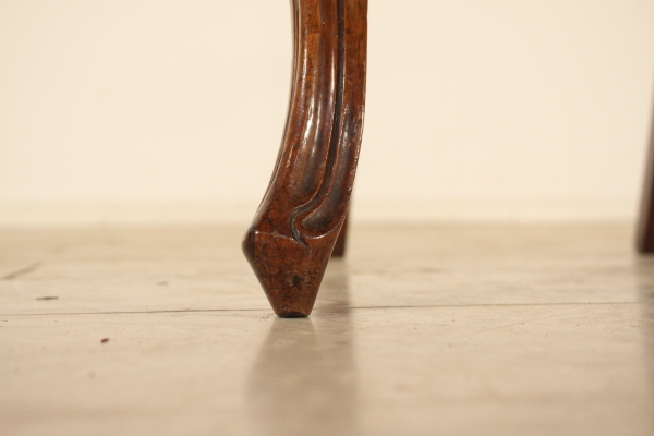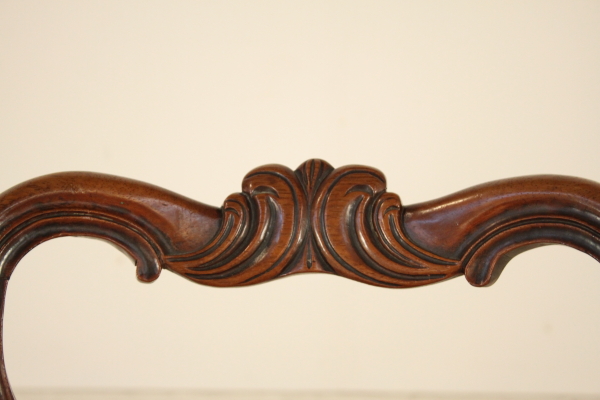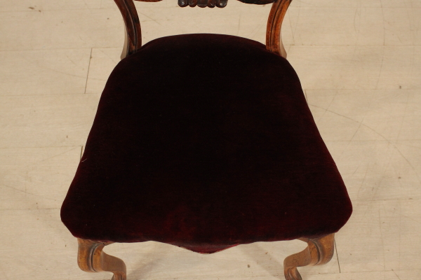 6 Gruppe Stühle. Vorderbeine und geschnitzten zurück bewegt sich in Sabre. Rückenlehne mit geschnitzten Ordnern. gepolstertem Sitz.