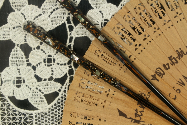 Mit Knochen Schienen und chinesischen Stäbchen, dargestellt auf große Deckchen und in Teca gespeichert.