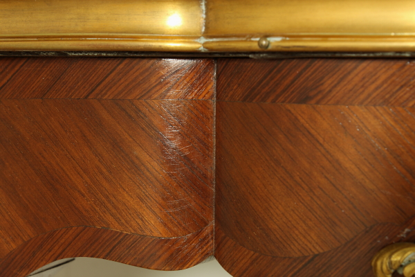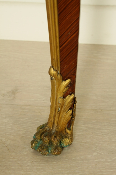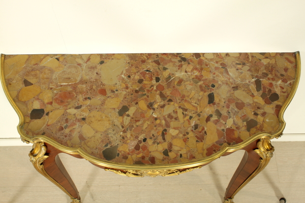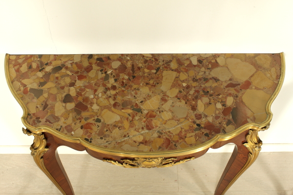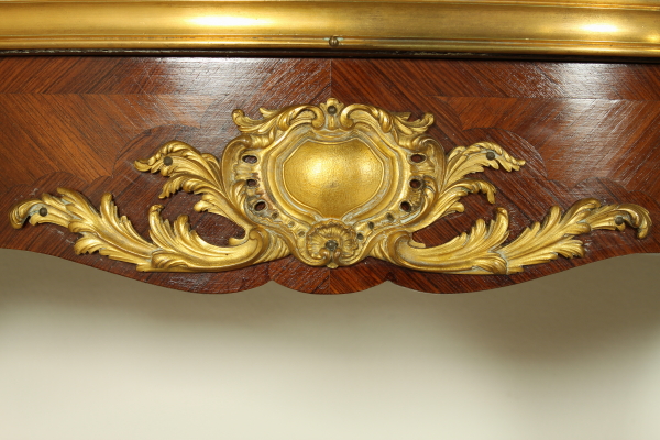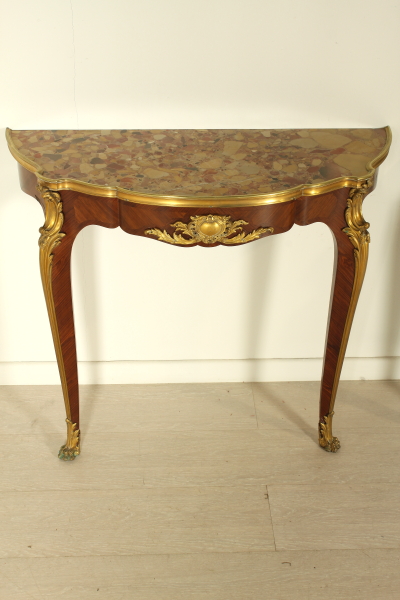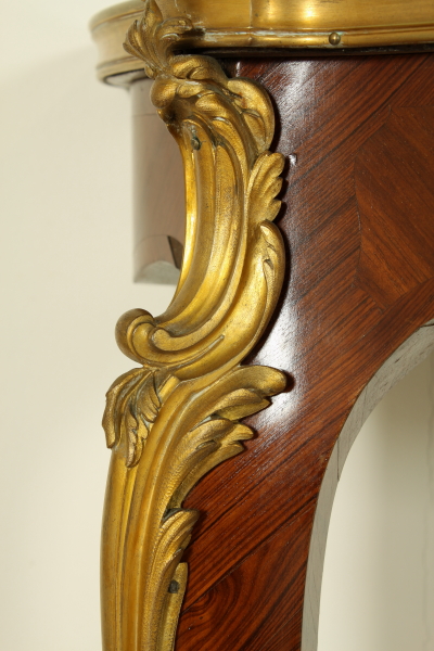 Paar Konsolen. Unterstützt von Beinen mit Bronze Fries mit Fuß Ferino endet. Band geformt mit Mahagoni Reserven und zentrale Fries. Geformte Oberteil mit eingelassenen Marmor und Bronze Rand einzigartige Verschmelzung. Vergoldeten Bronzen.