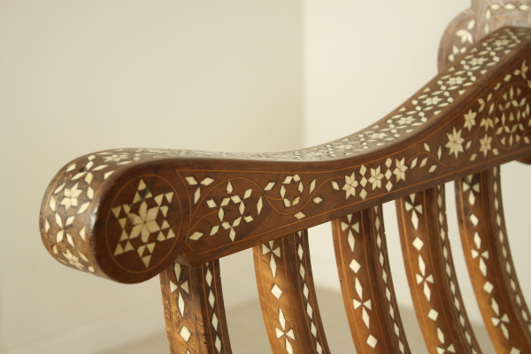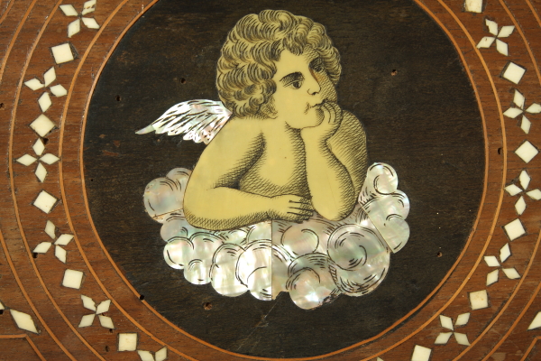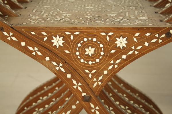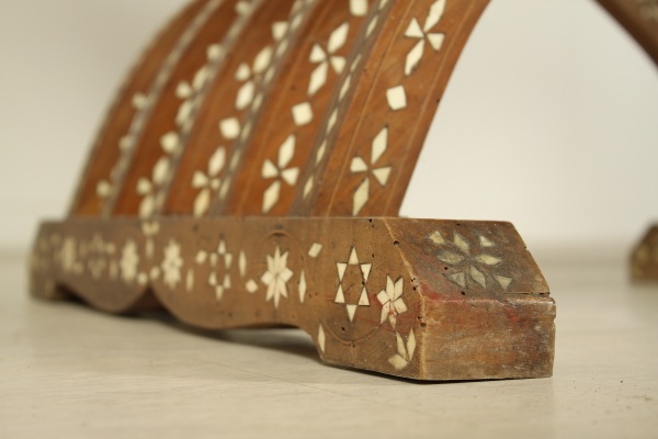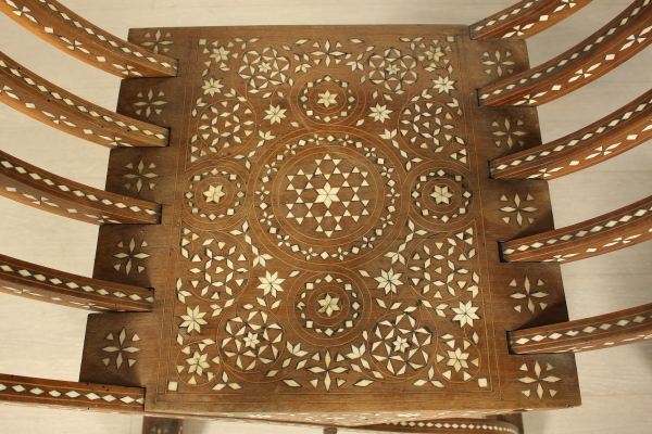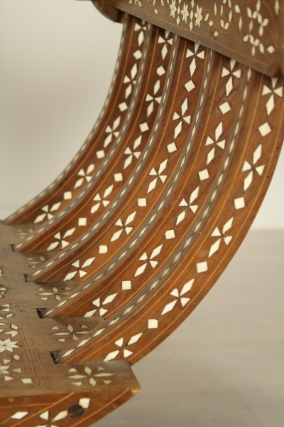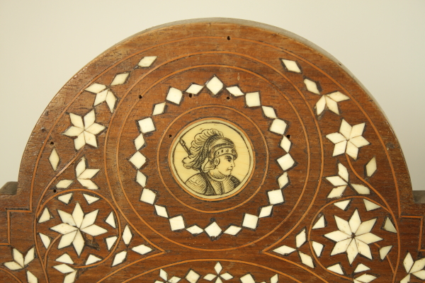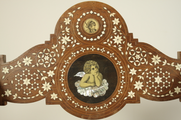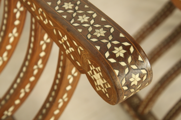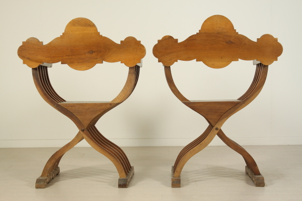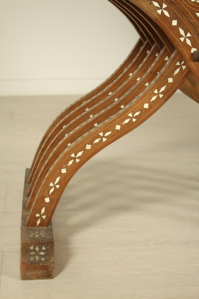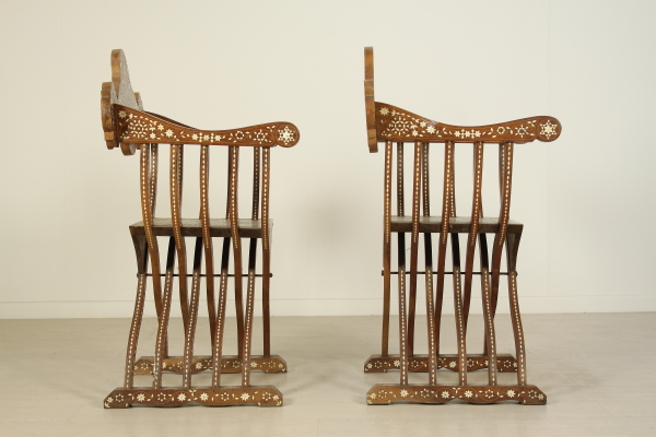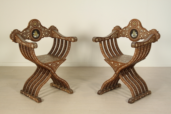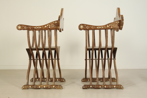 Savonarola Stühle mit Sitzfläche und Rückenlehne mit Nussbaum förmigen Ordner mit Perlmutt und Elfenbein Darstellung Putto Reserve. Ganz eingelegten Toppo in Elfenbein.