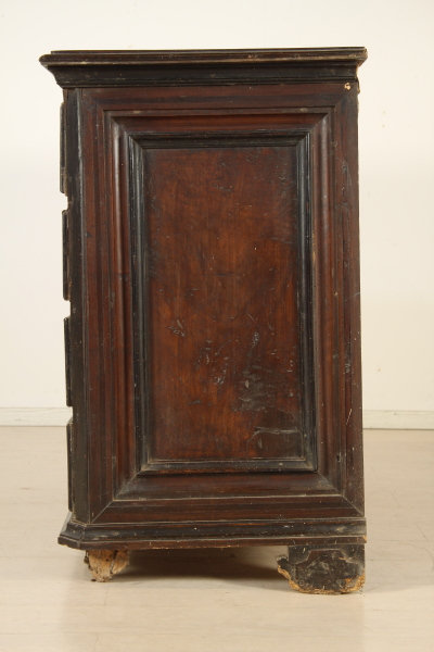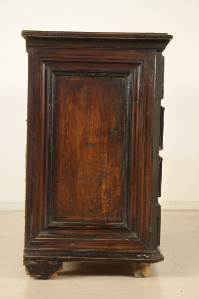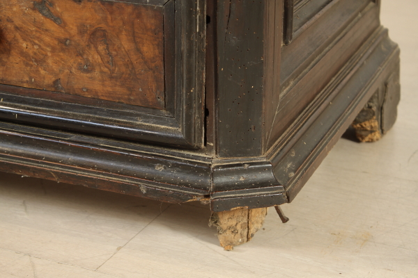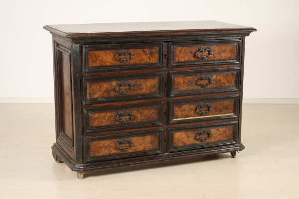 Canterano Lombardo-Venetien. Canterano h X Schubladen von denen die erste ursprünglich für geradlinige geöffnet. Auf der Vorderseite der Schubladen mit Walnuss und Fruitwood Vorzeichen angewendet Briarwood-Ordner und Ebanizzate Ordner Ausstattungspaket. Oberteil in massivem Nussbaum Rahmen mit dunkel braune Lippe. Geschnitzte Halterung Füße. Sperren und zeitgenössisch Griffe.