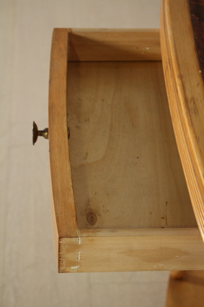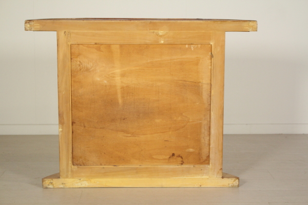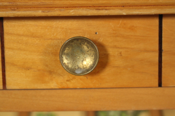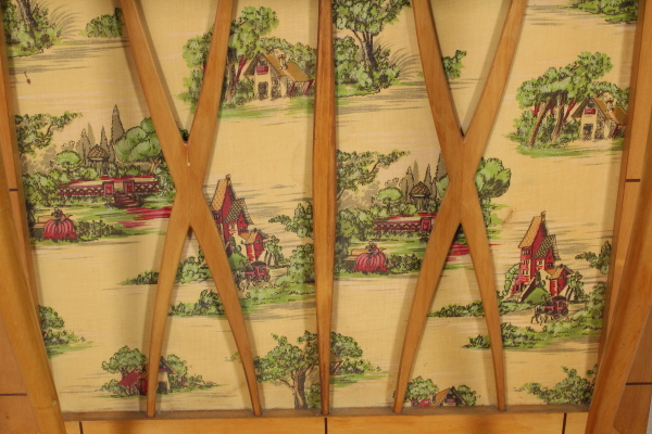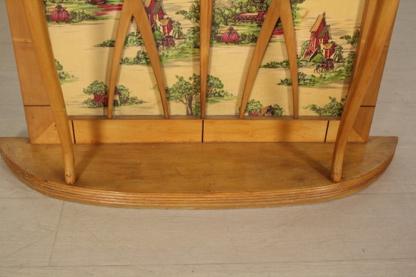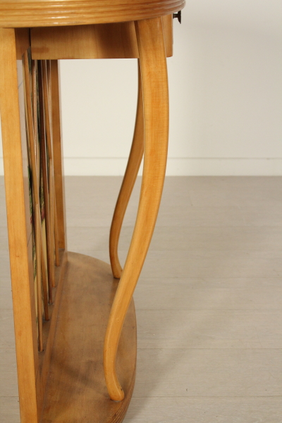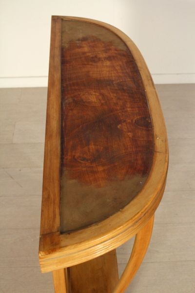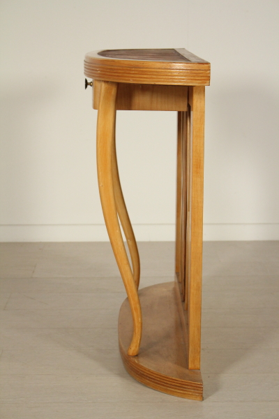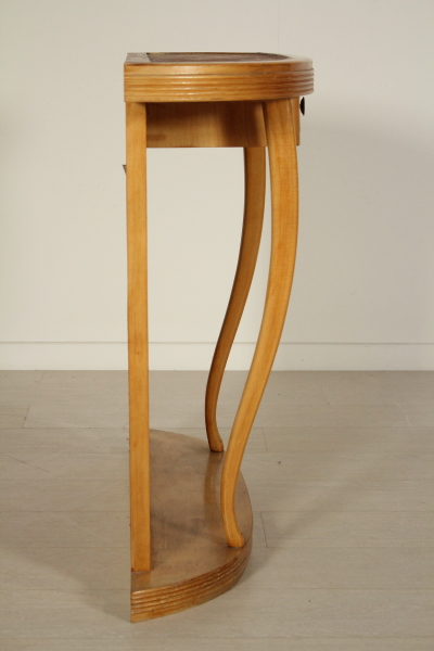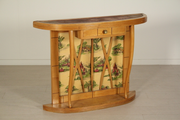 50 Jahre-Konsole. Ahorn-Holz-Konsole, Stoff. Fair Zustand, hat einige Gebrauchsspuren, Glas fehlt.