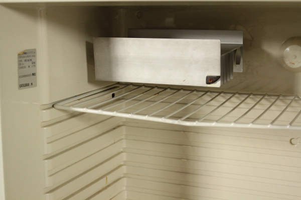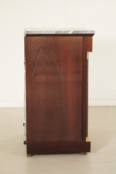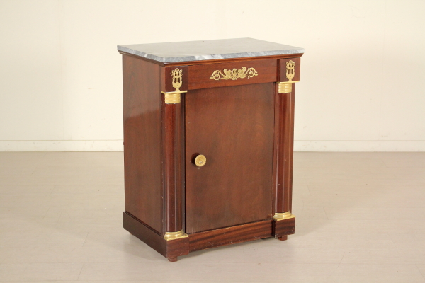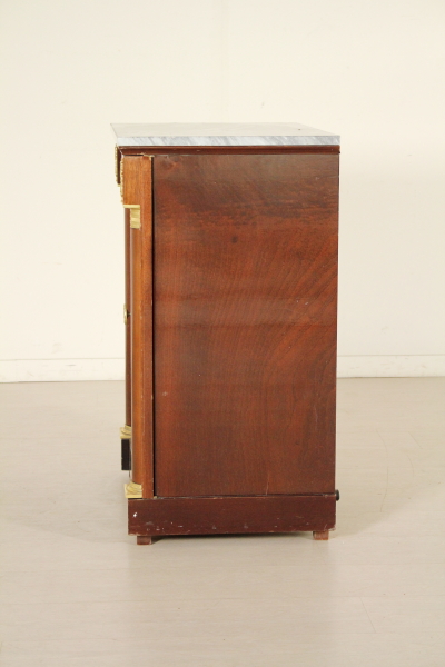 Pfosten mit Halbsäulen und Hauptstädten. Auf der vorderen Tür. Angereichert mit feinen Friese aus Messing. Marmor-Spitze. Fach im Kühlschrank.