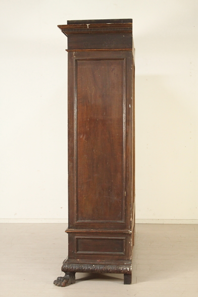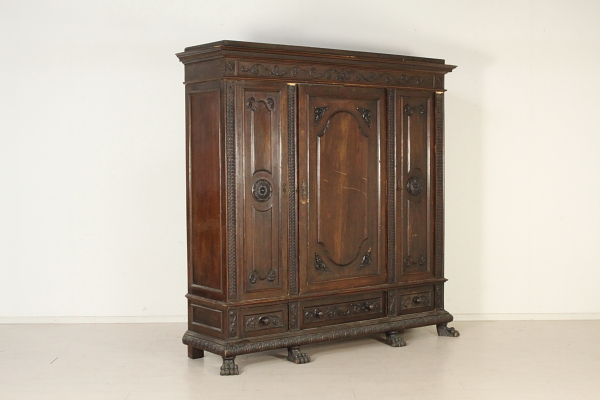 Kleiderschrank mit drei Türen und drei Schubladen. Durch die reich geschnitzte Ferini Füße unterstützt.