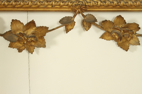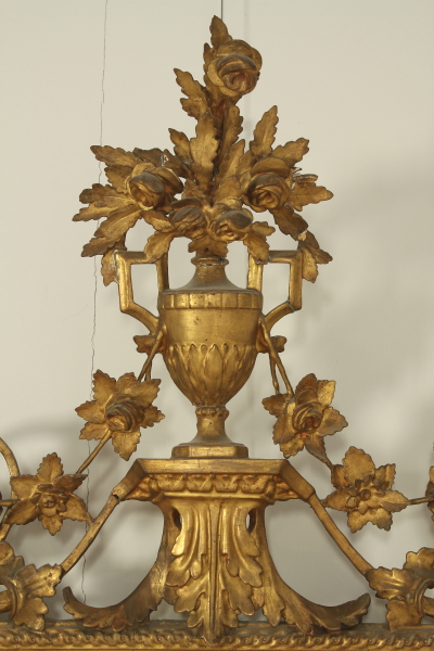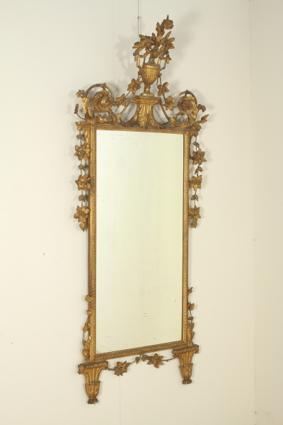 Holz Spiegel mit floralen Schnitzereien auf golden Leaf rund um die gesamte Oberfläche. Umgang mit Schnitzereien in Spiralen Fogliacee konfrontiert mit Akanthus Blatt base Biansata holding Schale mit Rosen geschnitzt und Eichenlaub. In der unmittelbar darauf folgenden Guilloche Kerben. Füße aus Glas und Grembialino mit floralen Schnitzereien.