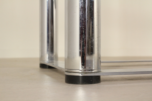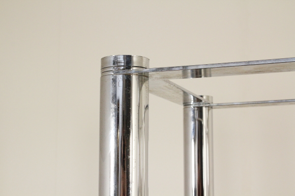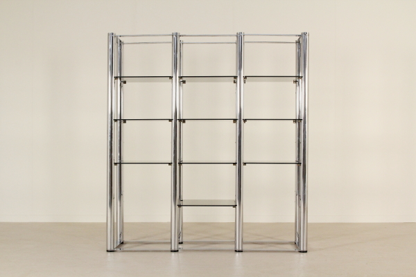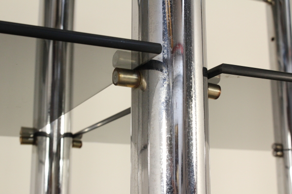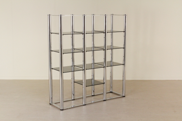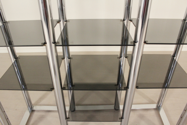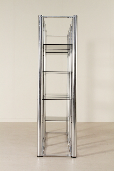 Libreria; struttura in metallo cromato, ripiani regolabili in vetro fume. Buone condizioni, presenta piccoli segni di usura.