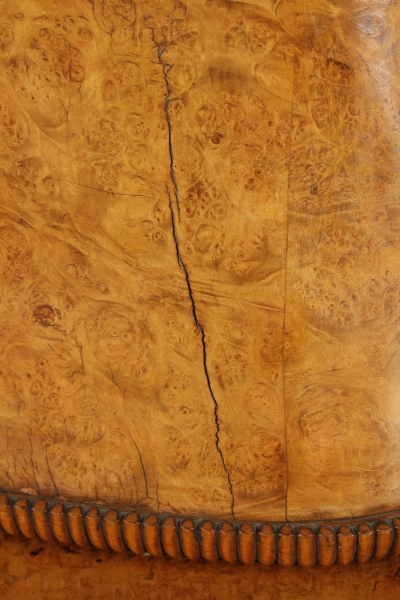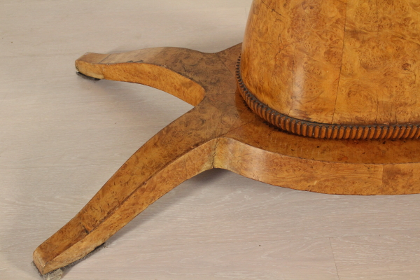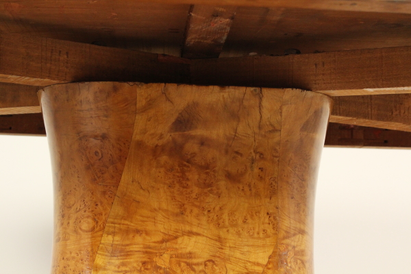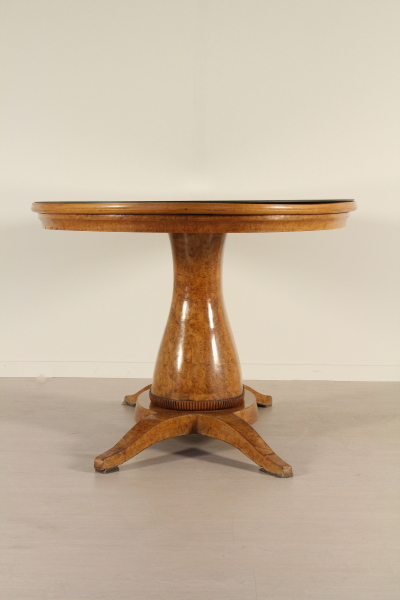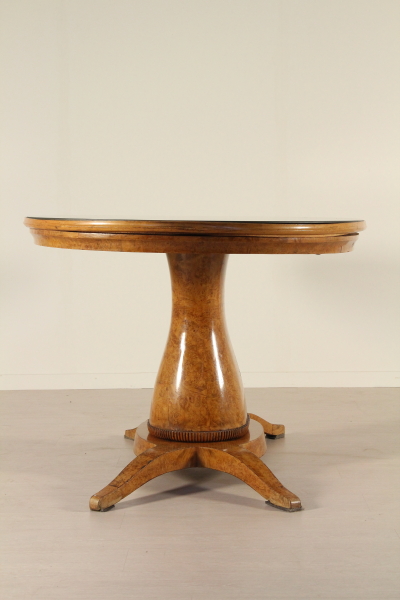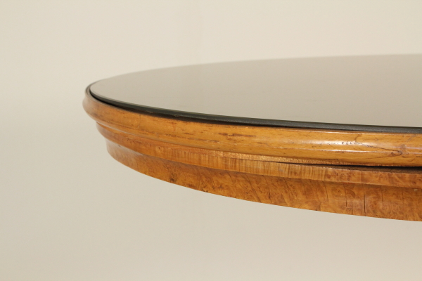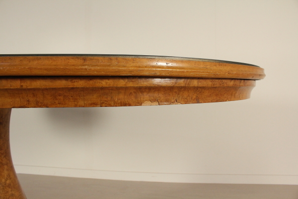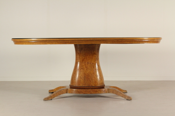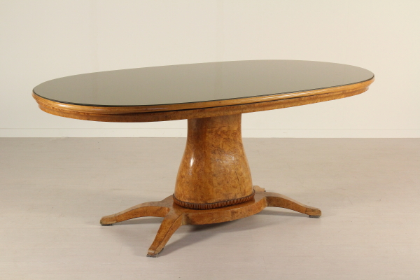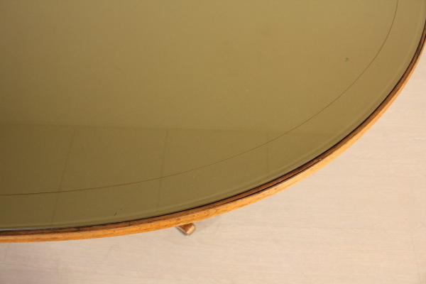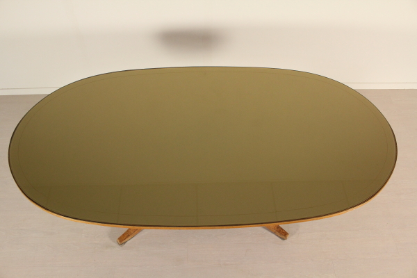 Tafel in elliptische Form; Nussbaum furniert, Holz, Glas wieder lackiert. Guter Zustand, zeigt wenig Anzeichen von Verschleiß.