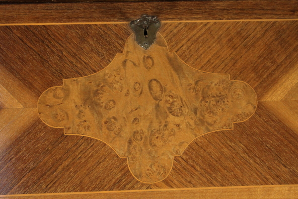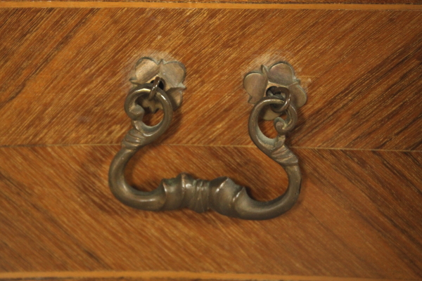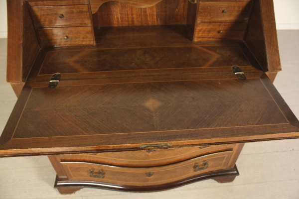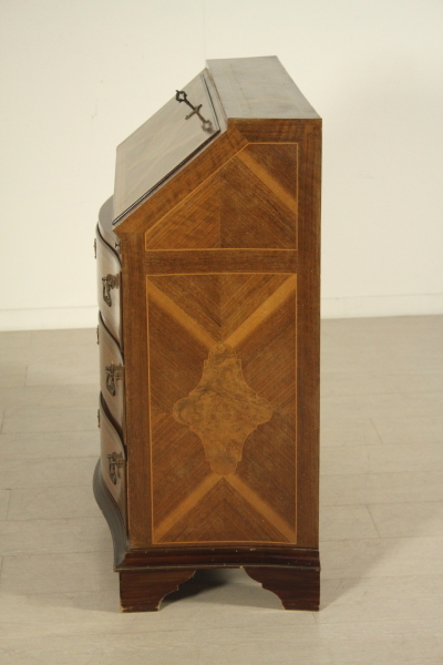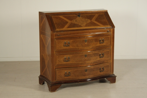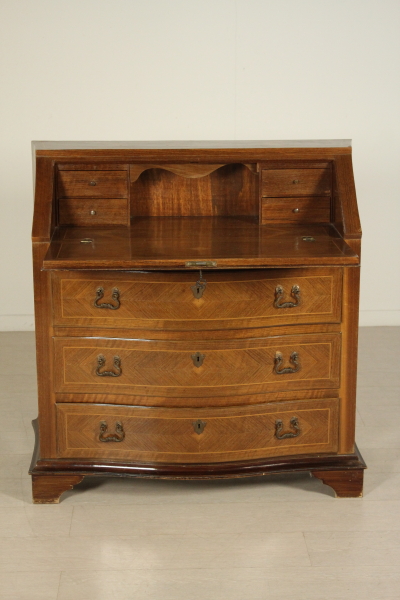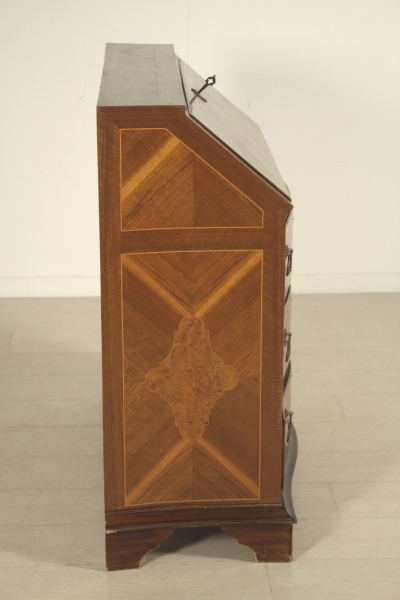 Verschieben Sie auf der Vorder- und geraden Hüften vom Fuss bis ins Regal. Verfügt über drei Schubladen und Drop-Leaf-Tür mit Ziehlaschen unter. Innerhalb vier Schubladen und offenen Fach. Vierergruppe Furnier mit Nussbaum Bestände.