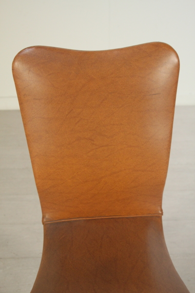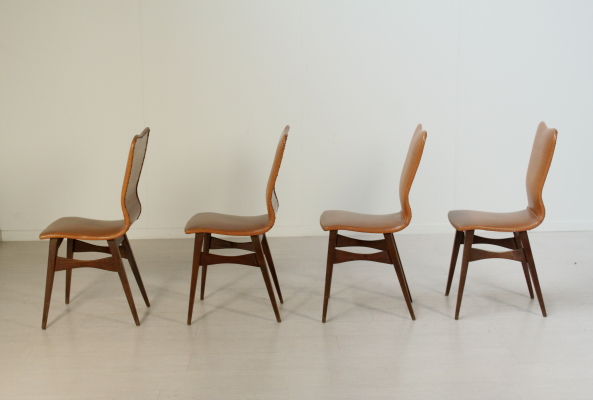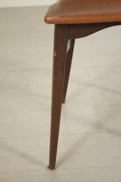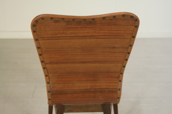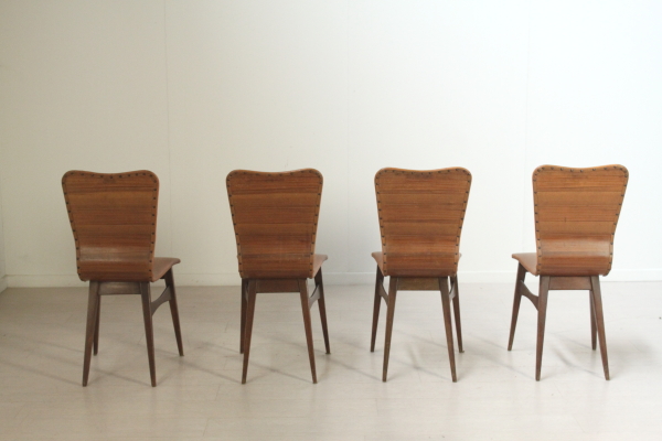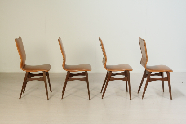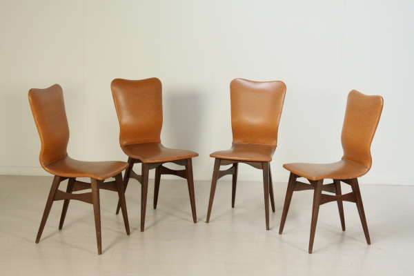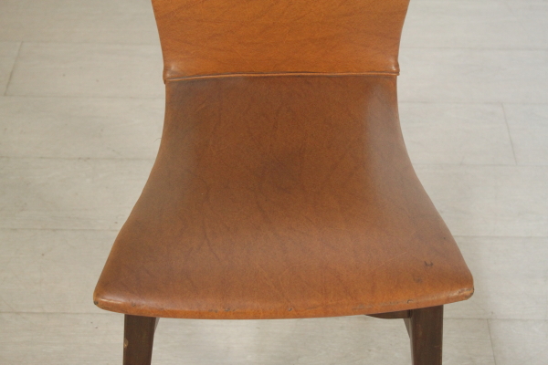 Satz von vier Stühlen; gefärbt, Buchenholz, in Palisander furniert und mit Kunstleder überzogen. Guter Zustand, wenig Gebrauchsspuren zeigen.