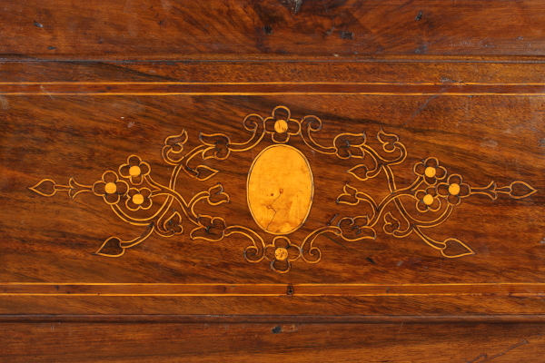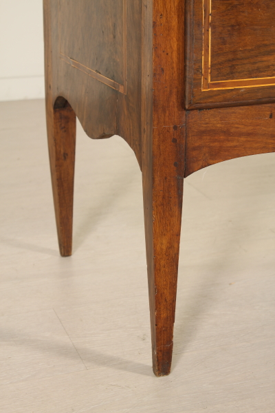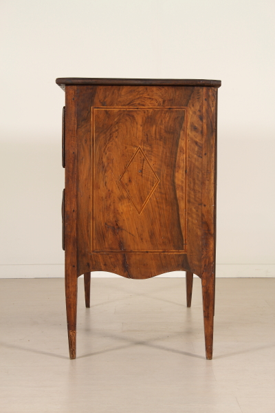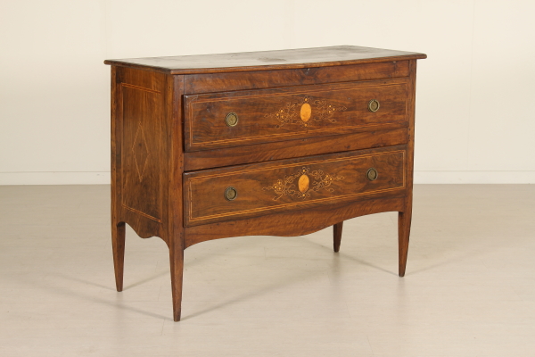 Kommode-Trunk Beine von Schneeballsystemen gehalten. Auf der Frontschürze und geformten paar Schubladen mit Threads und floralen Intarsien mit zentralen Medaillon. In geometrische eingelegtes Gewindeflanken. Intarsien, Toppo.