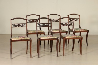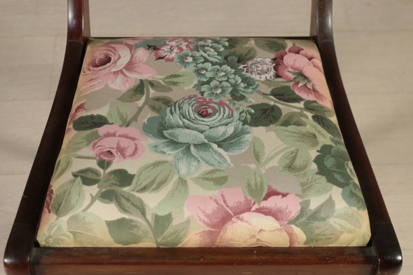 Gruppe von sechs englische Stühle, Mahagoni Beine bewegt, floral Stoff Sitz und Rücken Tag geschnitzt haben. Sitzhöhe: 44 cm.