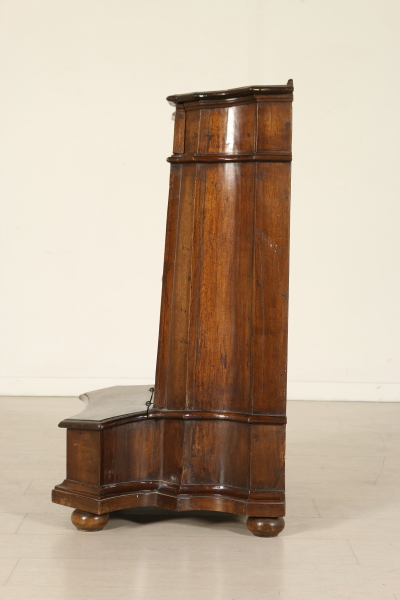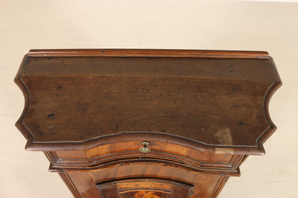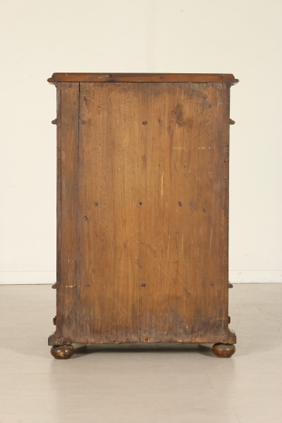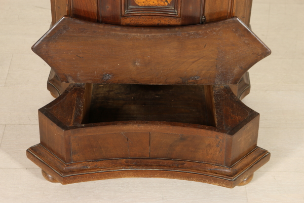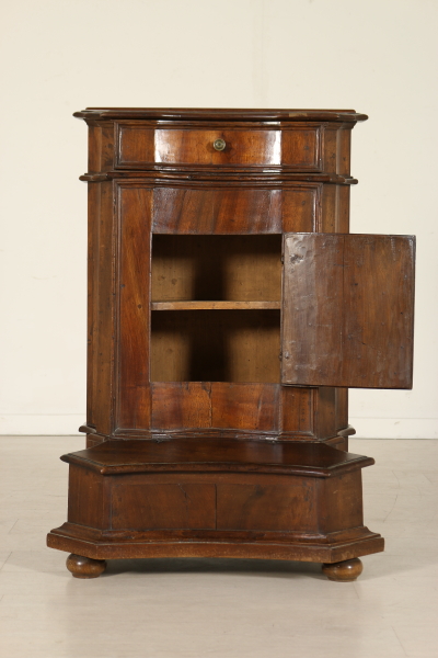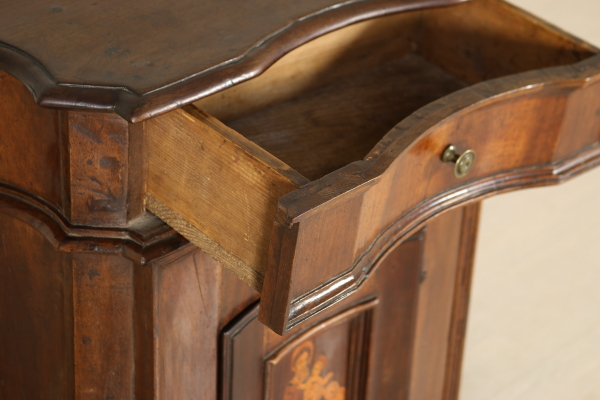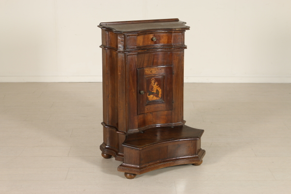 Massives Walnussholz Knieen zog vorne an den Seiten mit Schublade und zentrale Tür. Auf den ersten Blick die eingelegten Türverkleidung Darstellung der Madonna mit Kind. Bauchige Füße und Knöpfe in Bronze. Das Kabinett ist unbeschädigt und Patina.