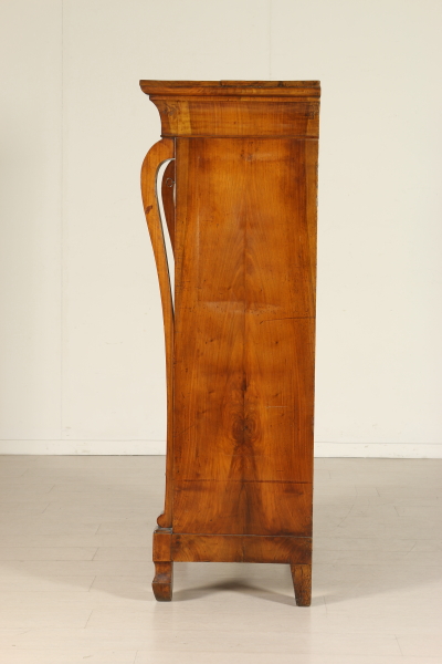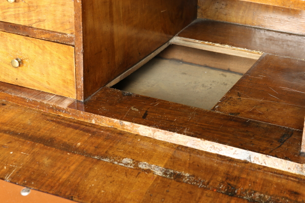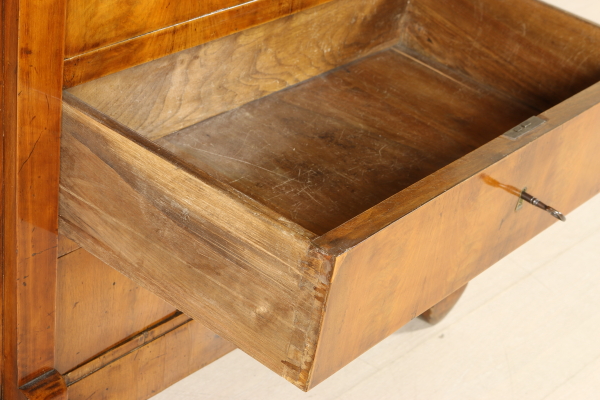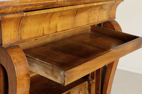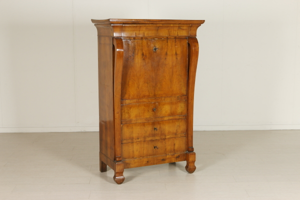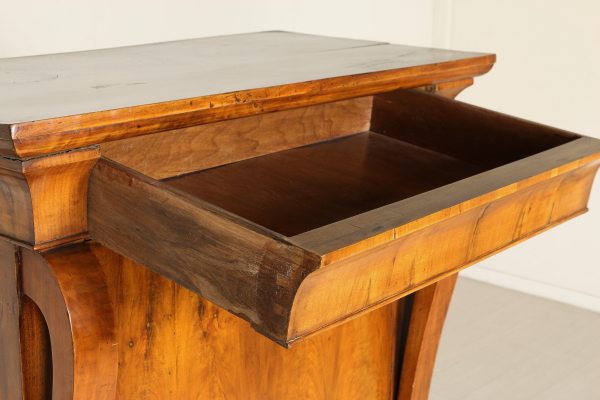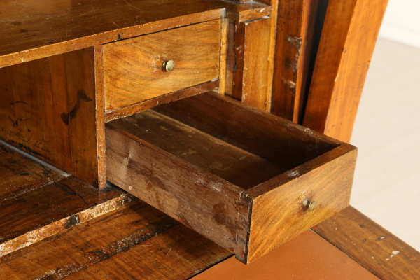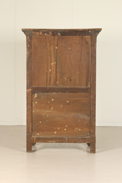 Pfosten mit umspritzte Pilaster und Füßen jar. Drei Schubladen und Klappe Türen mit Leder nicht gleichaltrig und Scarabattolo. Interne Pilaster mit Blatt gearbeitet. Schublade geformte Halterung.