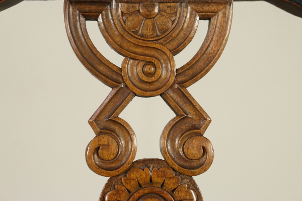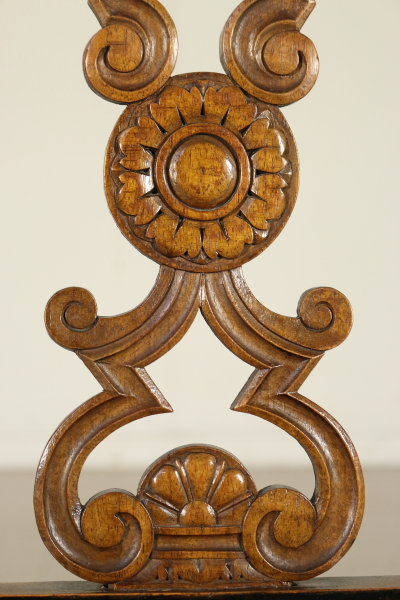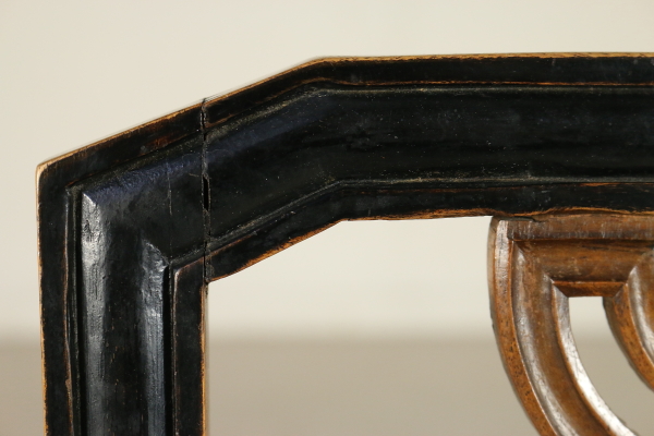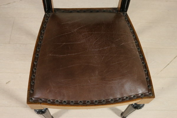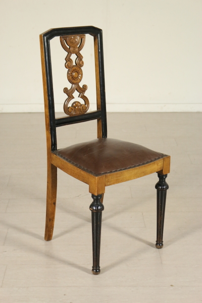 Gruppe von sechs Stühlen; Nussbaum, geschnitzt, Ebenholz Farbtöne wohlgeformten Beine, weiche Polsterung, gepolstert in Kunstleder. Fair-Zustand, zeigen einige Gebrauchsspuren.