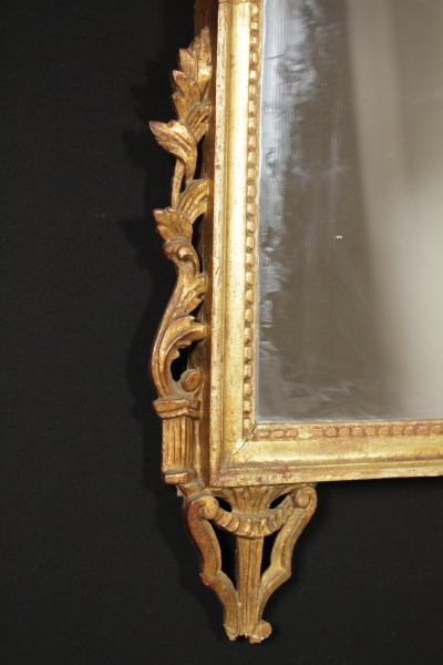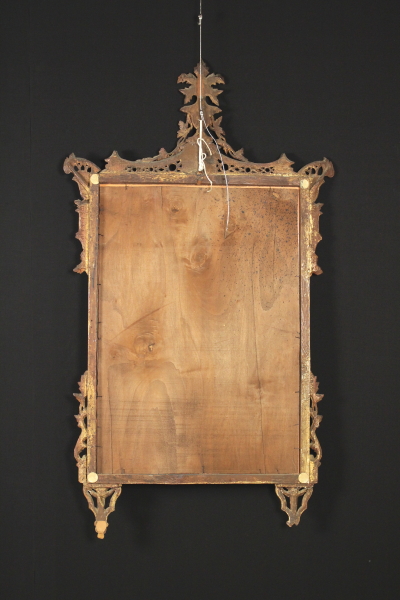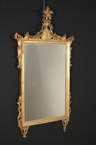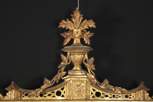 Volute e cimasa intagliate, battuta a motivo ripetuto. Dorata.