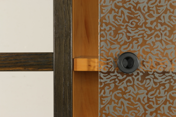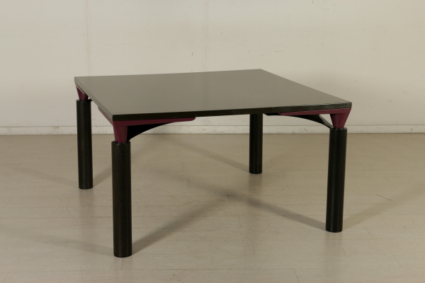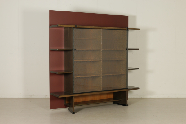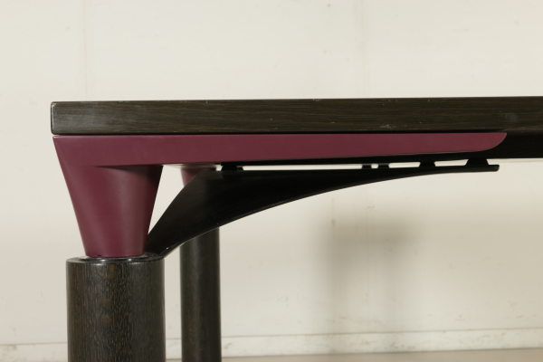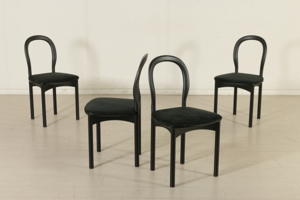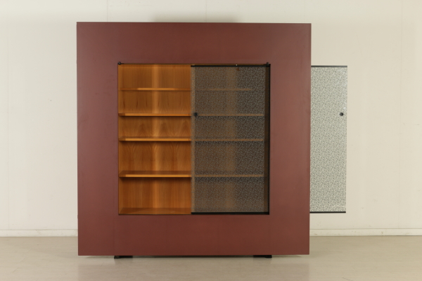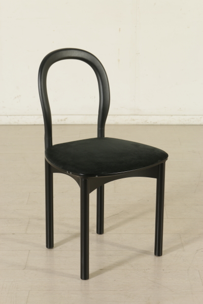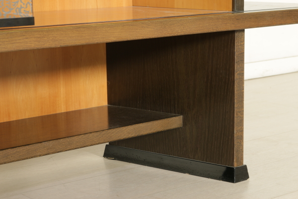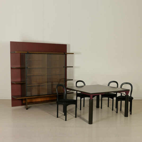 A sitting room designed by Francesco Binfarè for Cassina. Composed by: showcase (model: Angel), table (model: Lom), four chairs (model: Domia). Showcase with sliding door and attached frame which can be used to expand the table surface. Stained oak wood and pearwood for the interiors, screen printed crystal door. Table with extractable tops, where the showcase frame can be placed in order to expand the surface. Stained oak wood, metal basement, resin tops. Group of four chairs, lacquered wood basement, resin seat frame, polyurethane backrest with metal core, foam seat, fabric upholstery.