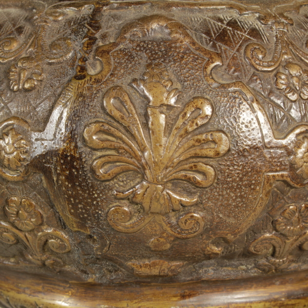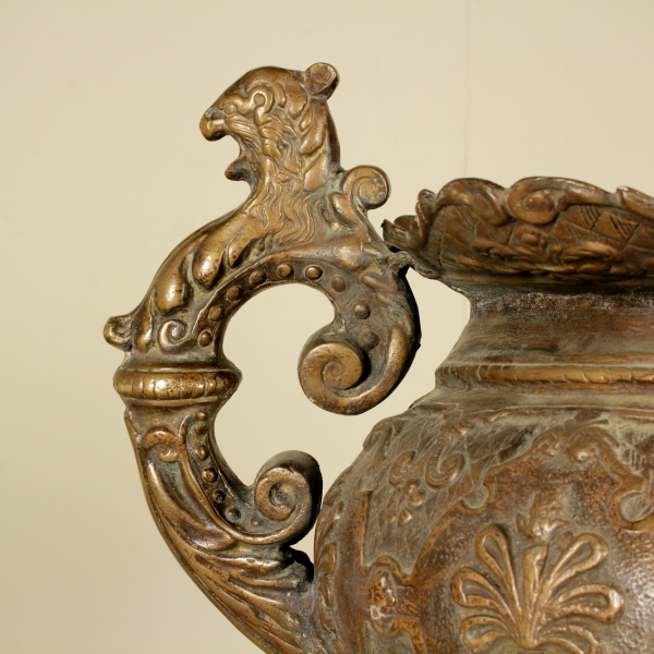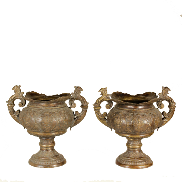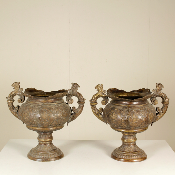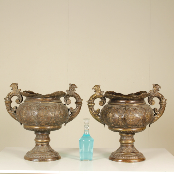Pair of vases in bronze decorated with ribbons and flowers chiselled in relief. Anse leaves and fantastic animals.