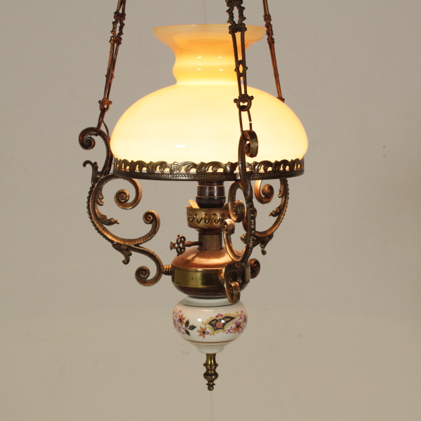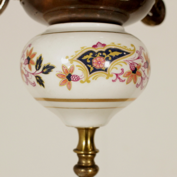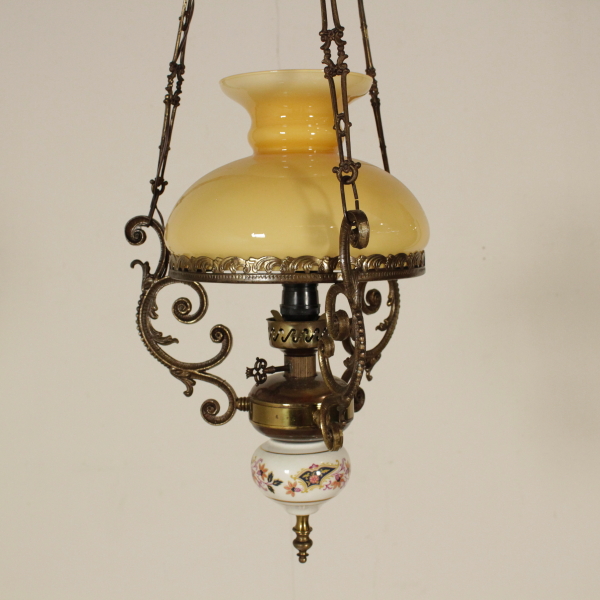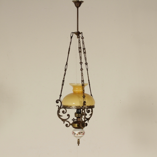 Chandelier decorated. Three scrolls in brass and the lampshade in colored glass. Ceramic ball golden.