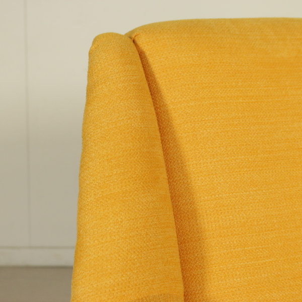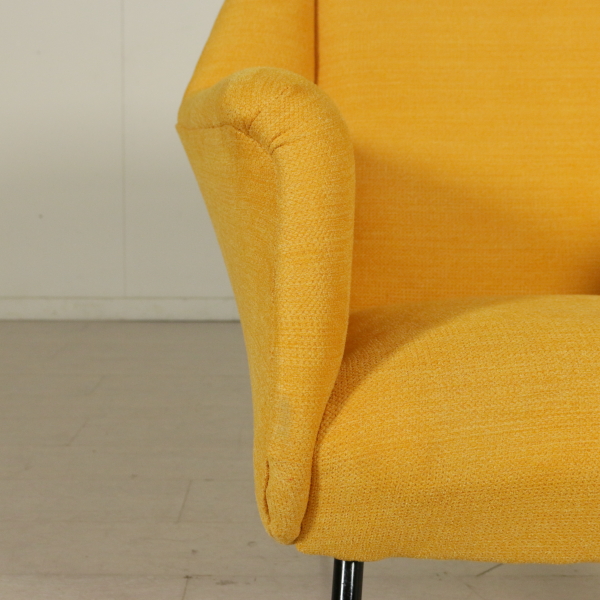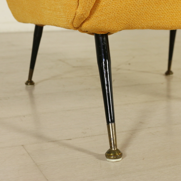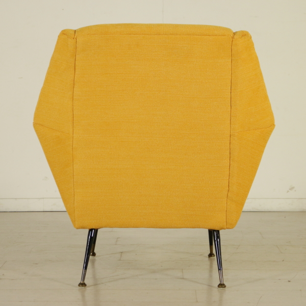 An armchair, foam padding, fabric upholstery, metal legs with brass tips. Manufactured in Italy, 1950s-1960s.